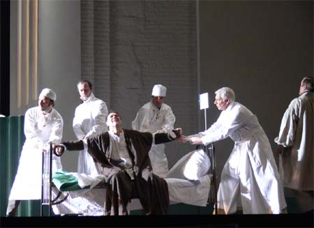 Идеи братьев Чайковских отменяются: музыка Петра звучит, слова Модеста произносятся, но интерпретирует режиссёр «Пиковую даму» «по Пушкину». Никакой пули в финале – Герман оканчивает свои дни в сумасшедшем доме, точнее в Обуховской больнице. Причём пребывает он в ней с самого начала спектакля: именно безумные видения, проплывающие в его воспалённом мозгу – суть картины оперы, которые видит перед собой Герман. Именно в этих бредовых фантазиях оказывается возможным вальс Германа и Графини в её спальне, явление старухи на балу вместо обещанной императрицы Екатерины, и много ещё прочих надуманных изобретательным режиссёром вещей, интересных самих по себе, но не имеющих никакого отношения к Чайковскому. Льву Додину очень хочется поставить повесть Пушкина, рассказать историю расчётливого немца Германна (именно так, по Пушкину, с удвоенной «н» на конце – как фамилия, а не как имя) и глуповатой воспитанницы Лизаветы Ивановны с известной долей иронии, с которой к своим героям относился Пушкин, у которого, как известно, даже призрак Графини шаркал домашними туфлями. Всё это замечательно и вполне допустимо… но не в оперном театре! На самом деле такая интерпретация вкупе с музыкой Чайковского, которая написана всё-таки не в 30-е годы, а в конце 19 века, и изобилует крайне напряжённым драматизмом, не приближает историю к литературному первоисточнику, а в известной степени даже отдаляет – на сцене не Пушкин, и не Чайковский, а самый что ни на есть Петербург Достоевского. Этому, кстати, весьма способствуют и талантливые сами по себе декорации Давида Боровского. Очень глубоко, психологично, занимательно, берёт за живое, но… увы, это совсем не опера Чайковского!