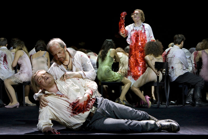 Хор в смешанном составе вповалку лежит на сцене всю вторую половину спектакля. Сцена ли это соблазнения молодых рекрутов, военный ли это лагерь, битва дуэлянтов ли у хижины отшельника (!) в горах – хор, не шевелясь, лежит всюду и везде.