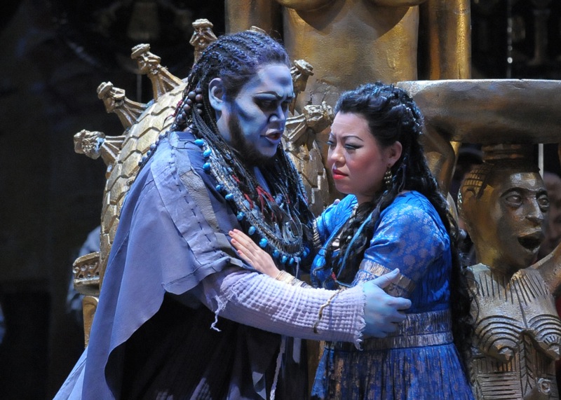 Марко Берти (Радамес) ни на какую «искру» и вовсе не замахивался: «пение ради пения» – вот его кредо. У тенора мощный и не лишённый обаяния голос, крепкий и стабильный, на переходе от середины к верху наблюдается некоторая зажатость, но сами верхи как таковые получается вполне свободными и убедительными, хотя ни о каком филировании на пиано финала «Celeste Aida», указанном в партитуре, речи, конечно, не идёт: форте, только форте – победное, сильное, уверенное. Что касается образа, то равно как в военачальника, мужественного полководца, так и в пылкого возлюбленного поверить очень трудно: на сцене все четыре акта пребывал завёрнутый в немыслимые балахоны статуарный и весьма неповоротливый в силу объёмов мужчина средних лет почему-то с собранными в хвост длинными русыми волосами и аккуратной европейской бородкой – зрелище, прямо скажем, не очень подходящее ни для Древнего Египта, ни для романтической истории Огюста Мариетта.