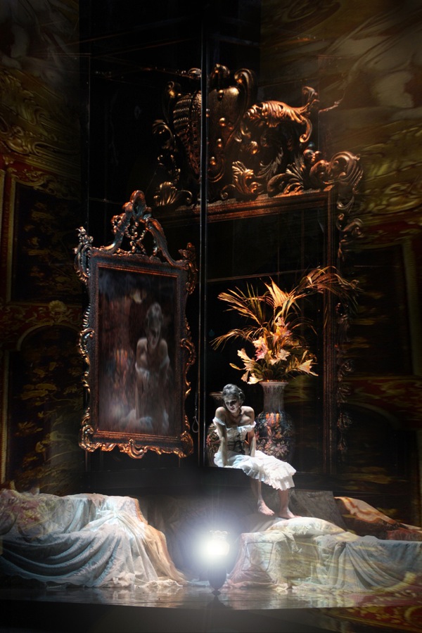 Пластическое решение самого спектакля Хуго де Ана во многом напоминает стилистику и образный строй фильма Висконти. «Чувство» - это элегантная, зрелищная и эстетичная костюмированная постановка, отдающая дань традиции и истории. Мы видим на сцене необходимые атрибуты, воссоздающие атмосферу Италии XIX века, начиная от цветового колорита с доминантой позолоты, роскошных костюмов и заканчивая элементами интерьера и сценографией в целом. Своеобразной визитной карточкой Хуго де Ана – сценографа является акцент на преувеличение отдельных деталей – барочной позолоченной рамы от картины, висящей в воздухе, изысканной вазе с цветами, «зеркальных» лентах, вертикально обрамляющих всю сцену.