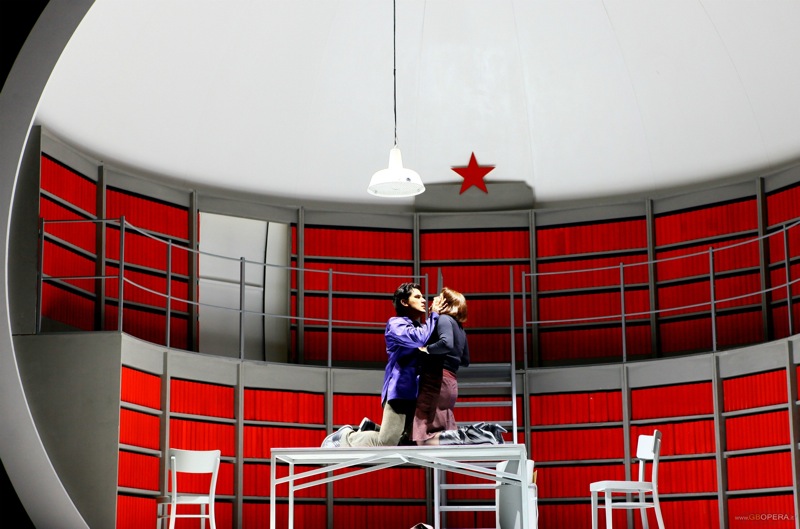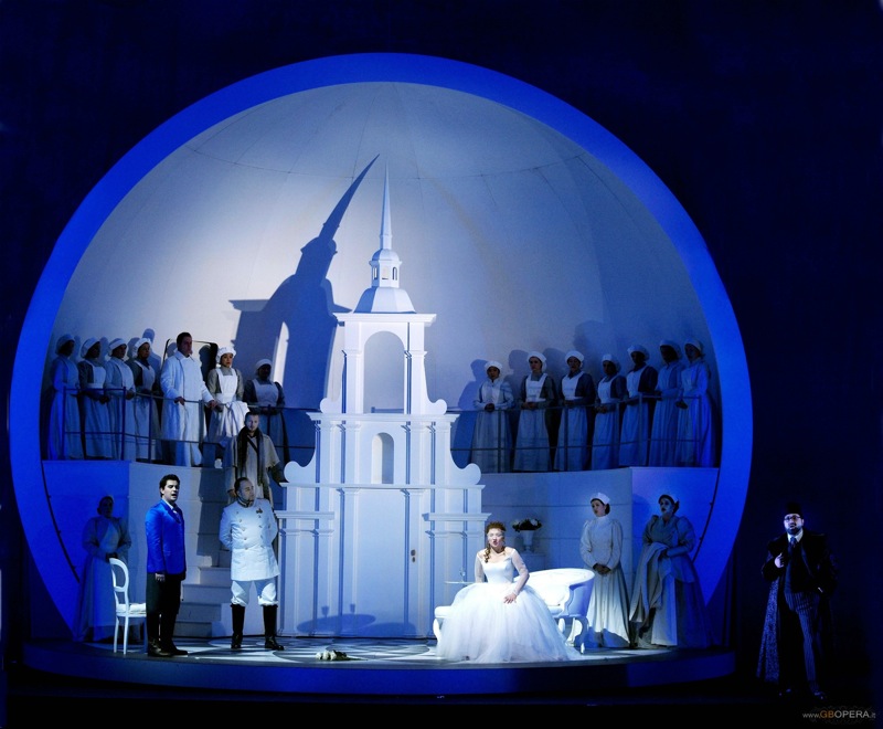 Атмосфера, в которую нас увлекают за собой режиссер и сценограф Бенуа Дугардин в «Иоланте», похожа на некую витрину в британском магазине «Селфридж» **, дополненную идеями художника Данте Габриеля Россетти. Идиллический кокон полностью белого цвета, помещенный в шар, который при развороте оказывается большим спутником. Лозунги на кириллице и появление красноармейцев к концу оперы создают своеобразный мостик от одной оперы к другой. Дело в том, что вместо преисподней, куда должны быть сосланы прелюбодеи Франческа и Паоло, они попадут в ГУЛАГ, где начальником лагеря предстанет Ланчотто Малатеста.