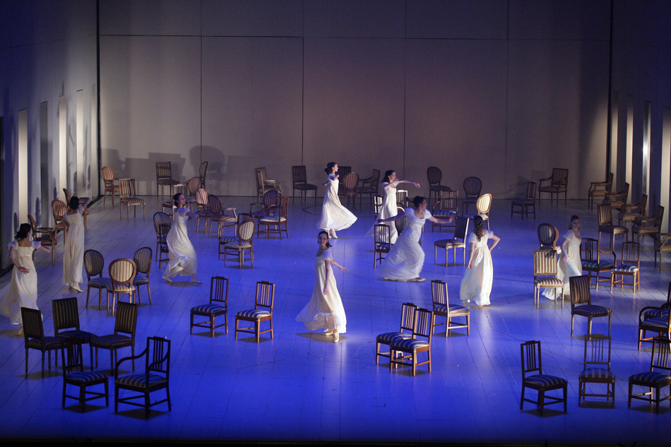 Сначала детальнее о сценографии Владимира Арефьева. Архитектоника сцены заключалась в лишенной исторической конкретики, практически абстрактной и монохромной лепке прямоугольного объема белого цвета, создающего универсальную жизненную среду для персонажей и действия (будь то дворцовый зал, усадьба, поле для сражения или городская улица), ограниченную рядом ниш-проемов по бокам, выполняющих роль своеобразных кулис, откуда появлялись артисты. Эти ниши, однако, не только ограничивали среду, но и размыкали ее, уводя нас через воображаемые двери куда-то туда, где тоже продолжается жизнь. Неизменные в течение всего действия (за исключением 1-й картины, решенной в поэтическом духе, как экранная проекция листвы дуба в Отрадном на белую стену) и лишь наполнявшиеся светом различной цветовой гаммы и интенсивности (отличная работа художника по свету Дамира Исмагилова), декорации с одной стороны создавали возможность для непрерывного кинематографического развития сюжета (очень важный режиссерский принцип спектакля)*, с другой — перекидывали «мостик» от давно минувшей ампирной эпохи Отечественной войны 1812 года в авангардную художественную среду первой половины 20 века, которая, безусловно, питала творческую мысль Прокофьева, пускай и опосредованно.