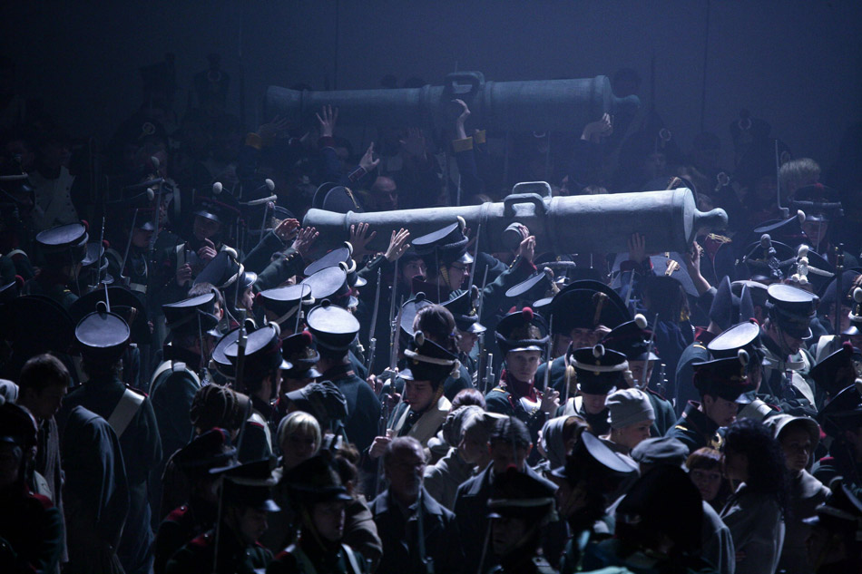 И тут впервые меня посещает мысль о том, что режиссер будто специально подталкивает зрителя к мысли — мол, все под контролем и дозировано. В такой обстановке любое движение масс обретает дополнительную функциональность. Вот русские солдаты, стоящие на авансцене (Бородинское поле утром перед сражением) отходят вглубь сцены и уступают место наполеоновской армии (Шевардинский редут). Вроде бы простая мизансцена, связанная с необходимость смены обстановки при переходе к следующей картине (движение масс тут сродни перемене декораций), вдруг обрастает дополнительным смыслом — русским войскам предстоит отступление!