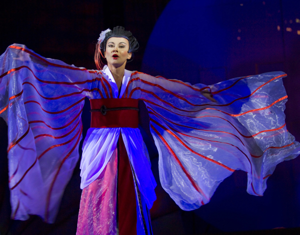 Как и положено, в центре драмы – образ бескомпромиссной молодой японки: партия и роль сколь желанная для примадонн-сопрано, столь и опасная и своей продолжительностью и, соответственно, нагрузкой на связки, и малым шансом достоверно сыграть пятнадцатилетнюю девочку, на глазах взрослеющую, превращающуюся в решительную, но оттого не менее страдающую молодую женщину. Режиссёру и исполнительнице роли Елене Разгуляевой образ удался – хрупкое, кукольное создание, поначалу полностью растворённое в своём объекте обожания, со схематичным поведением, с поклонами и семенением мелкими шажками, по ходу спектакля становится живой и очень реальной женщиной, духовно выросшей и оттого ещё острее осознающей свою обречённость. Удар судьбы, который, конечно, происходит не в момент прихода Кэт и Шарплеса, а растянут на две трети оперы (Баттерфляй Маликовой – Разгуляевой вовсе не так глупа и доверчива, она осознаёт всё почти сразу, но до какого-то момента не говорит об этом вслух), преображает Баттерфляй, делает ее из декоративной куколки-бабочки женщиной из плоти и крови. А ещё великое чувство материнства, что выпадает на долю юного создания, этот бесценный опыт, меняет героиню: из всех женщин Пуччини (Манон, Мими, Тоска, Турандот, Лю) Баттерфляй, несмотря на кровавый финал, всё-таки самая счастливая и самая цельная натура, ибо ей в жизни дано познать самое главное в предназначении женщины.