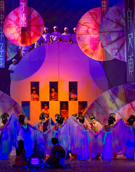 Таким образом, принцип «театра в театре», использованный Прокофьевым, усилен немецким режиссером Уве Шварцем многократно: возникает очевидный интерактив сцены и зала, зрители охотно включаются в эту игру, смеются, что-то выкрикивают, аплодируют. Для любого классического опуса это, наверно, было бы катастрофой, но для «Апельсинов» — ровно то, что нужно.