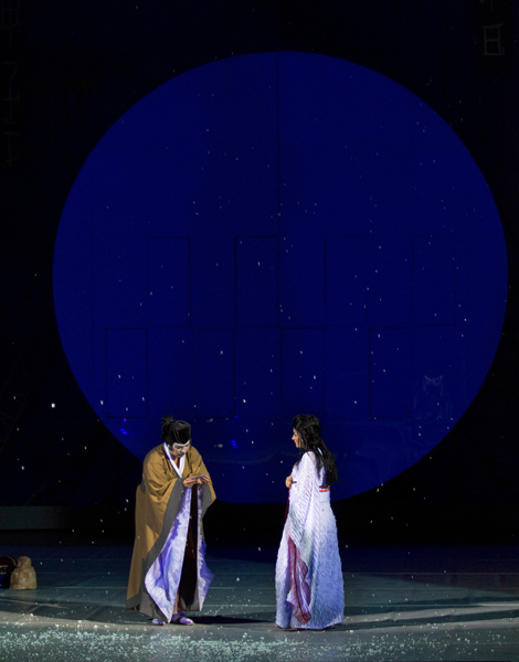Наиболее сильная сторона этого спектакля — замечательная сценография Елены Вершининой. Лейтмотив бабочки усилен цветочным антуражем, особенно мощно расцветающим на сцене в финале второго акта, когда героиня находится в радостном возбуждении в ожидании любимого. Спектакль традиционен в своей основе, но в то же время изъясняется современным языком: нет привычного японского домика, бутафорского сада. В центре композиции на все три акта – огромный белый диск: это и Фудзияма, и домик Баттерфляй, а в трагическом финале он вдруг оборачивается крейсером «Авраамом Линкольном», увозящим маленького сына Баттерфляй за океан и одновременно словно «раздавливающим» всё японское, хрупкий мир Баттерфляй-бабочки. Именно на этом диске в переломные моменты возникает проекция – воспоминания героини о судьбе ее отца, для которого, как и для его дочери, жизнь без чести оказывается невозможной.