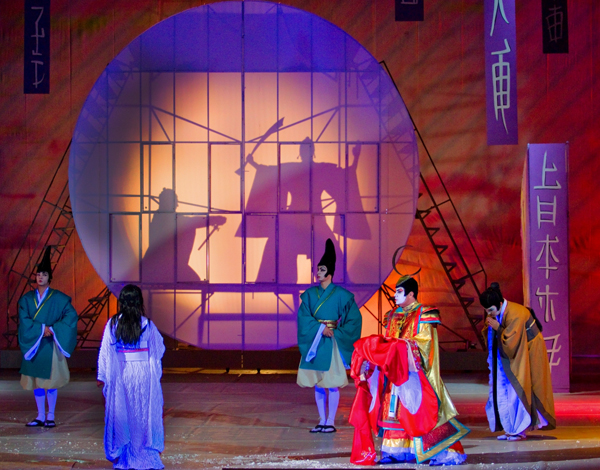 Восемь гигантских ширм-вееров, то разворачиваемых, то вновь складываемых и прекращающихся в узкие минималистические колонки-столбики каждый раз по-особому, в соответствии с задачами спектакля, формируют сценическое пространство. Тонка и работа со светом – во многом на контрастах световой партитуры держится драматургия постановки. Костюмы и американцев, и японцев узнаваемы – лишь однажды художница позволяет себе новый взгляд, но абсолютно попадающий в цель: ожидая любимого, Баттерфляй примеряет европейское платье – и её модный розовый наряд а ля Барби оказывается абсолютно таким же, как у Кэт Пинкертон – ход, бьющий наотмашь.