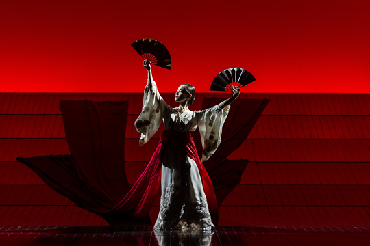 После смерти Мингеллы в 2008 году, его жена Кэролин Чоа восстановила постановку, оставаясь верной творческим концепциям своего мужа. Она же была и остается хореографом спектакля. Начало, как и финал, впечатляющи — красный экран широкоформатного кино, на фоне которой появляется Чио-Чио-сан в белом свадебном платье, опоясанном четырьмя красными же поясами, растянутыми невидимыми слугами на четыре стороны. В этом же наряде она и закончит свою жизнь, но очень деликатно и эстетически. И только наличие тонкого кинжала и эти красные пояса, разведенные в стороны, своими очертаниями напоминающие разбегающиеся струйки крови, дадут нам понять, что совершилось ритуальное самоубийство. Одна из самых ярких трагических сцен оперы.