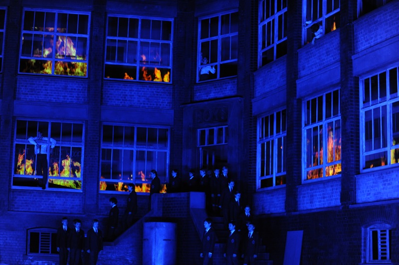 Олден в каком-то смысле вновь замыкает действие на Тезея, только существенно в ином ключе. Так или иначе, этот античный герой становится главным персонажем, а благодаря его воспоминаниям и появляется школа со всеми ее «язвами», сигаретами-наркотиками, насилием и жестокостью. Современность школы, конечно, достаточно условна и распространяется примерно на последние 50 лет. Во всяком случае, очевидный намек на время действия дается в живописном портрете молодой ныне царствующей королевы Елизаветы II, несколько раз фигурирующем в спектакле и привносящем в него сатирическую ноту. Этой временной аллюзией Олден показывает, что ему в данном случае важнее не конкретика личностных ассоциаций бриттеновского детства, протекавшего, как известно, в 20-е годы прошлого века, а более современный и широкий социальный подтекст…