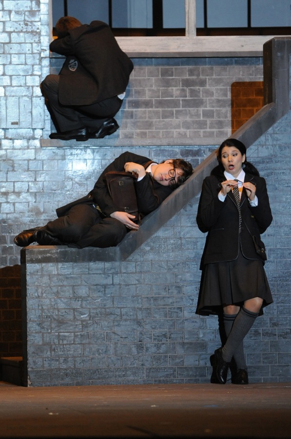 В постановках «Сна» всегда очень большое значение придается эпизодам с афинскими ремесленниками (здесь техперсоналом школы), репетирующими, а затем и разыгрывающими историю любви Пирама и Фисбы. Эти комические островки, «театр в театре» – благодатный материал для режиссерской фантазии. Олден проявил здесь себя с лучшей стороны. Во всяком случае, детализация сцендвижения и степень индивидуальной пластики образов была высокой, особенно это касалось, разумеется, колоритных Основы и Флейты. Перевоплощение последнего в женский образ Фисбы было обыграно особенно тщательно и, в то же время, многозначно, обозначая еще и гендерную тему. Собственно, в этом же контексте надо рассматривать и участие в опере контратенора, которому Бриттен поручил партию Оберона.