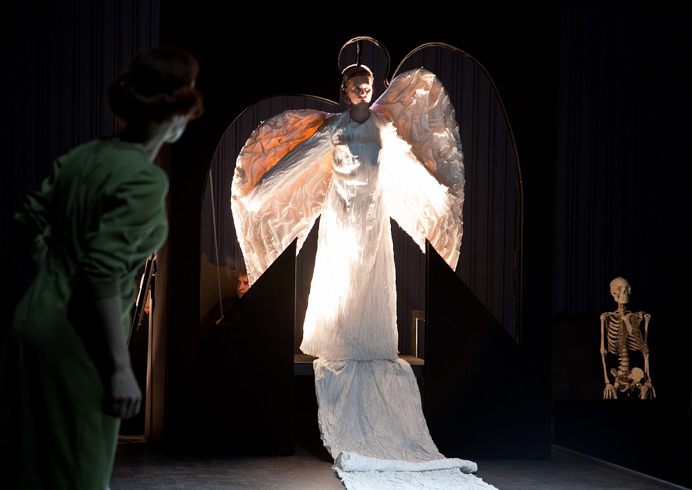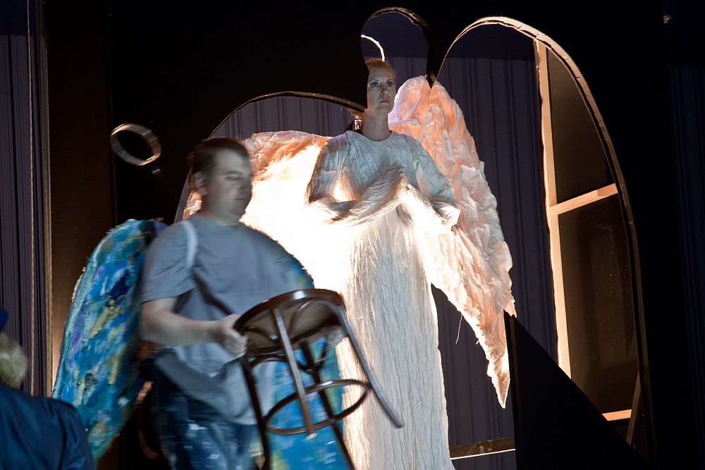 Вот является Ангел-хранитель, посланный Богом для наставления людей на путь истинный! Или пред нами комнатка, некий макет жилища, где течет обыденная жизнь и молодая семья пестует своего первенца. Облик всего столь же нагляден и вполне безыскусен, как «вертеп» в рождественские дни. А костюмы персонажей? У них здесь много смысловой нагрузки, но она также легко «читаема». Прежде всего, с их помощью история связывается с современностью, сиюминутность с вечностью. И действительно, самый верный оперный способ передать связь времен именно через костюм, внешний облик артиста. Идея не нова, но от этого не становится хуже. Второе – аллегоричность. Разум – очкарик-«ботаник» (в нашем случае в женском образе), Благоразумие – в строгом костюме с галстуком, Наслаждение – в избыточно цветистом одеянии, Мирская жизнь – женщина-вамп в вечернем наряде.