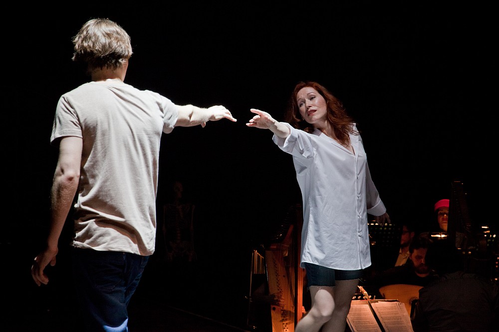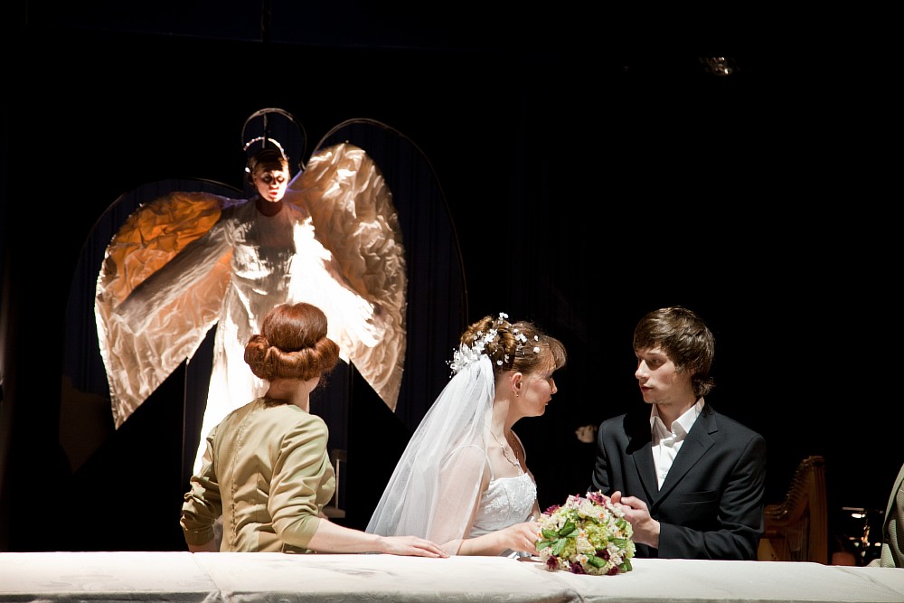 А явлено было вот что! Представление шло на только что открытой обновленной малой сцене театра, сделанной в виде трансформера. И это уже знаково. Таким образом, была создана единая среда для погружения в «игру» исполнителей и зрителей. Это первое. А далее целый веер впечатлений. Казалось бы, близость к актерам-лицедеям имеет свои издержки – неизбежно видишь все артистические шероховатости, которые в обычном зрительном зале, где сцена отделена от публики рампой, да еще вдобавок и оркестровой ямой, не так заметны. Но для того и нужны были все изложенные выше пространные размышления, чтобы понимать – «приобретения» тут дороже «издержек». Мы – в игре, и все ее несовершенства не вне нас, а внутри совместной «игры» и составляют ее родовую особенность, благодаря чему, говоря языком диалектики, «снимается» противоречие. И так во всем. Слушая исполнителей поначалу думаешь – о каком собственно пении здесь идет речь? А потом – да это и не вокализация вовсе в классическом понимании этого слова, а некое особое интонирование с налетом инструментальности.