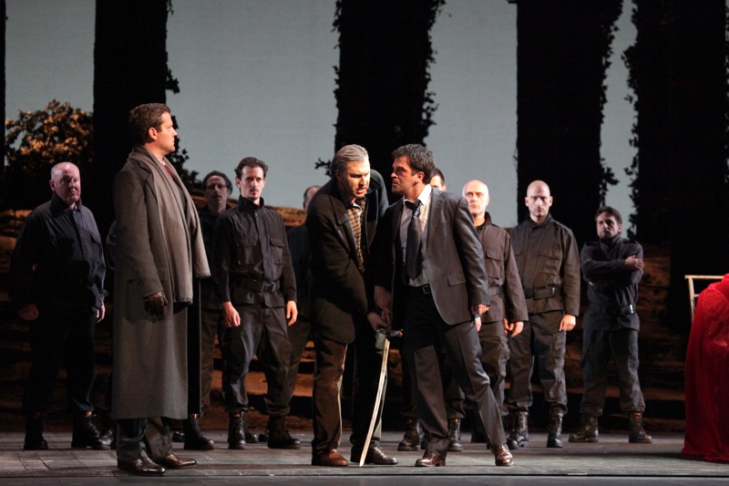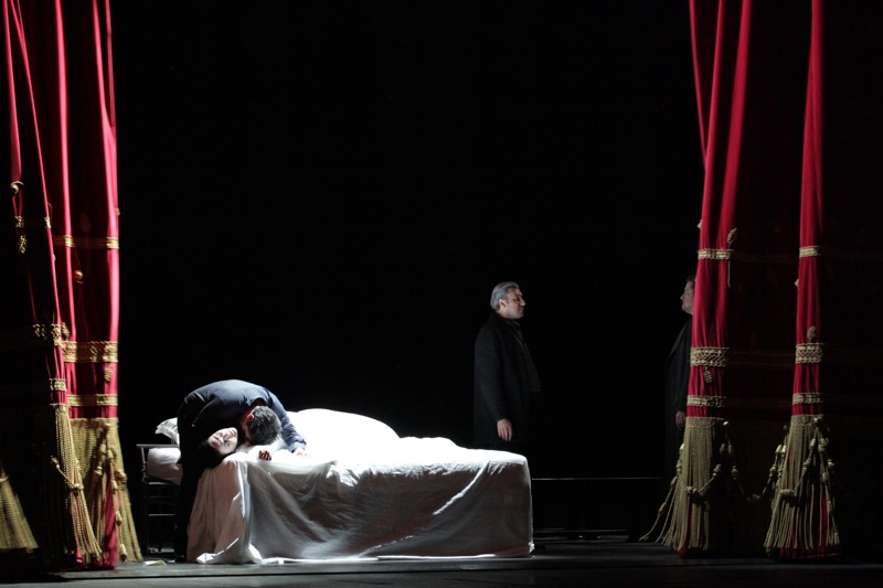 Как реализуются эти намерения на деле? На сцене «Ла Скала» предстает нечто статичное и маловыразительное... фраза должна бы закончиться словом «зрелище», но на зрелище спектакль Мартоне никак не тянет. Сценография Серджо Трамонти делает ставку на два основных элемента – густой лес на втором плане, создающий атмосферу мрачной таинственности с оттенком тревоги, и двуспальную кровать на первом плане, вокруг которой «крутятся» все сцены объяснений персонажей. На кровать же падают бездыханными Луиза и Рудольф в финале. Ложе покрыто белоснежным покрывалом, когда служит влюбленным, и кроваво-красным во время арии графа Вальтера и дуэта Рудольфа с Федерикой. Во втором действии фигурирует красное кресло, на которое Вурм опрокидывает бедную Луизу с целью изнасиловать ее. К этим деталям, по существу, сводится роль Мартоне, спектакль получается монотонным и лишенным подлинной жизни. Если в нем есть жизнь, то это надо поставить в заслугу артистам. Можно было бы представить оперу в концертном исполнении, и от этого мало бы что изменилось.