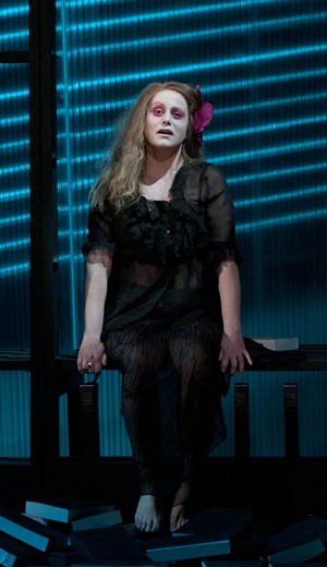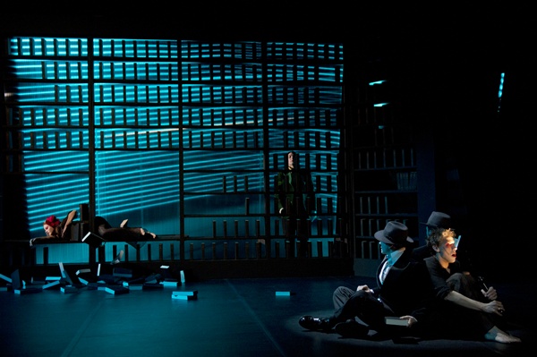 Обе оперы идут в одних декорациях. Постановщики поместили страшилки По в мир детства, в атмосферу детской сказки: действие разворачивается в библиотеке, среди книг. Родерик Ашер, печальный молодой человек, бродит в поисках своей больной сестры Мадлен, которую врач, кажется, держит в своей власти. Два рассказчика наблюдают и повествуют о кровосмесительной страсти, невероятных положениях во гроб и воскрешениях, записанные в дневники жениха Мадлен Филиппа. Дамиан Пасс их пропевает, Александр Павлофф (чтец в первой опере) исполняет драматические монологи. Филипп Аддис, который был трогательным Пеллеасом в спектакле «Опера-комик» под управлением Гардинера в июне 2010 года, дает Родерику дрожь и неустойчивость вокализации, в целом уместные для сюжета этой оперы-триллера, Валери Кондолюси (Мадлен), недавняя стажёрка Парижского центра подготовки оперных певцов, придаёт своей героине краски нежности, лиризма, но одновременно и безумия, Александр Дюамэль своим густым и одновременно железным басом умело рисует образ врача-демона.
