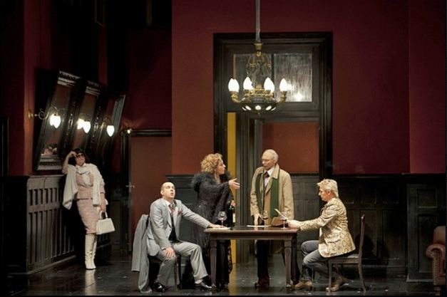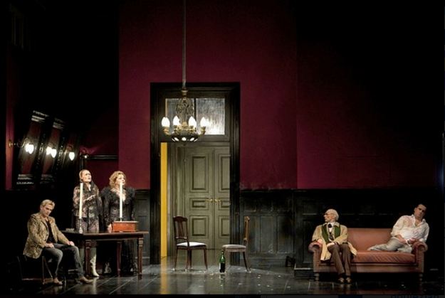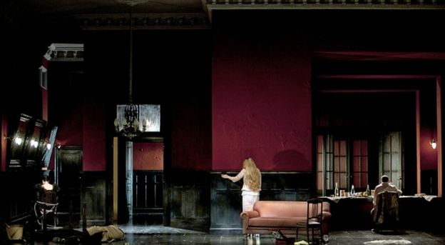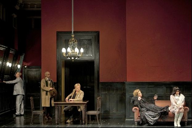 Но как уложить в это прокрустово ложе Верди? А запросто. Герои оперы играют в сюжетно-ролевую игру, инициатором которой выступает Азучена – здесь бывшая или стареющая примадонна, примеряющая на себя роль психоаналитика. Всё действие замкнуто в одном интерьере то ли квартиры, то ли офиса. Наивные бельгийцы! Они пишут, что Черняков, наконец-то, расстался со стереотипами советского прошлого. Эти дубовые панели, прямоспинные кондовые стулья, кожаный диван явно родня всем министерским и прочим «цековским» кабинетам, что и до сих пор можно увидеть во многих наших присутственных местах. Пожалуй, цвет не совсем обычен – бордово-гранитный, вполне себе «мавзолейный». А многорожковая люстра с тупыми грушевидными плафонами на потолке и бра ей в масть! Говорят, что из брюссельского антикварного магазина? Ха, а у нас на многих станциях московского метро точь-в-точь такие же! И все эти любовно поданные камерой дверные ручечки, тяжёлые картинные рамы (сценограф Черняков внимательно-дотошен к работе телеоператоров, вникает в каждую мелочь!) Да, на сей раз обошлось без бомжей и «прикида» с Черкизона. Костюмы героев вполне респектабельны, бледно розовое букле-жакет и юбка у Леоноры и тёмный шикарный балахон Азучены словно куплены в соседнем бутике.