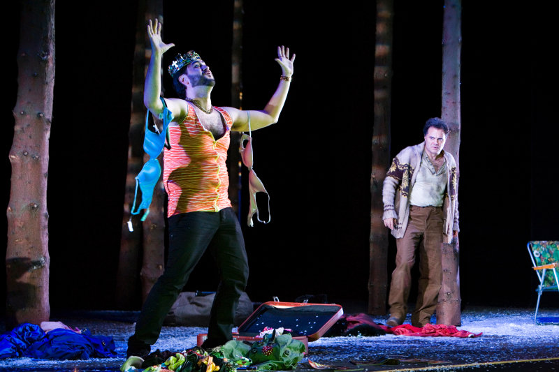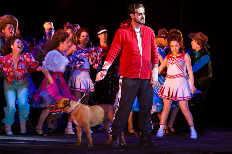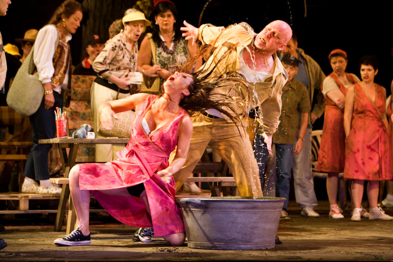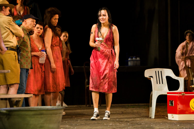 (То есть, ну никак невозможно поверить в концепцию оперы Бизе без живой собаки, как же мы слушали её до сих пор?!) Также на сцене установлен таз, в который то головой, то всем телом засовывают несчастную исполнительницу титульной роли, так, что ей приходится петь сложнейшую и прекраснейшую партию в постоянно мокрой до нитки одежде, всей в потоках холодной воды, льющейся с волос.