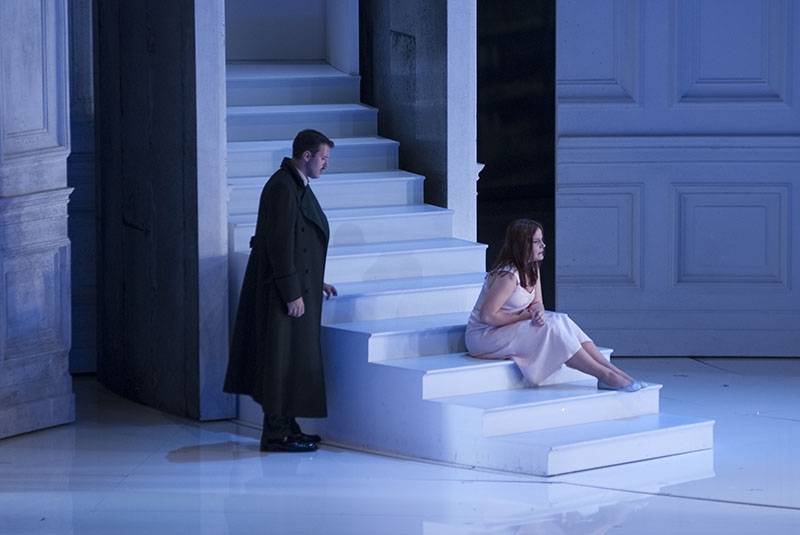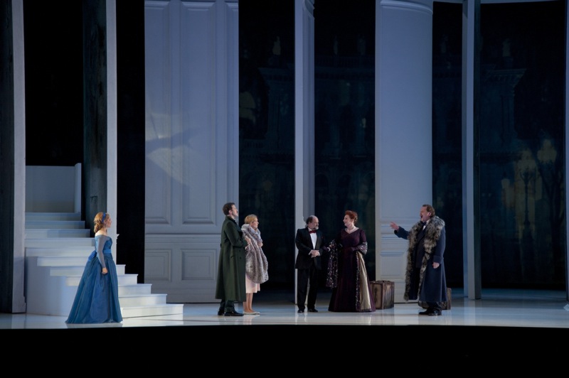 Ощущение вторичности усилено режиссурой и сценографией Марко Артуро Марелли: для тех, кто видел его «Кавалера розы» — любую постановку, по всему свету, в любом театре мира — общие черты подхода очевидны и явственен нежелательный эффект вышеупомянутого дежавю. Огромное пространство сцены Бастилии Марелли оставляет практически голым – даже в первом акте вместо фешенебельного гостиничного номера, куда привёл своё семейство граф Вальднер в надежде разбогатеть с помощью карточной игры или удачно состряпанного замужества старшей дочери Арабеллы, мы видим какое-то неуютное тотально белое пространство с мимолётными чёрно-белыми «проблесками» Вены за окнами, появляющимися, когда стенные планшеты скользят, несколько видоизменяя скучное пространство сцены. Ощущение шика от этого пространства есть, видно, что оно респектабельное и дорогое, но в то же время присутствует и ощущение избыточной пустоты, с которой режиссёр не знает, что делать. Активно задействован сценический круг: если бы не его вращения, несколько оживляющие картинку, первый и третий акты воистину невозможно было бы высидеть.
