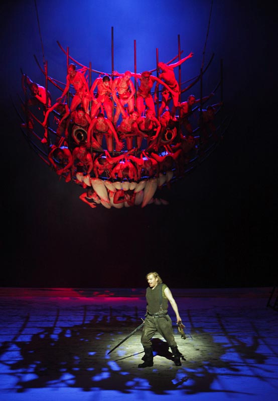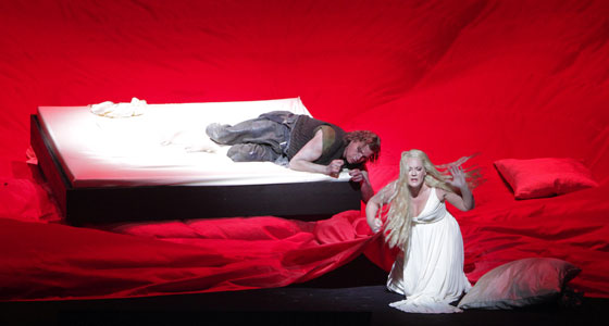 Ещё более оригинальными мне показались пластические рисунки ролей как главных, так и второстепенных персонажей, которые были решены в пантомимно-примитивной манере детских телешоу, и меня до сих пор поражает, как режиссёру удалось не скатиться в банальную цирковую пошлость: настолько органичными оказались вкрапления этих кривляний, так удачно всё легло на музыку и текст, что диву даёшься, почему никто раньше не применял столь простого и очевидно выигрышного подхода к интерпретации этой части «Кольца». Кульминацией всей этой восхитительной вульгаризации становится, разумеется, финальная сцена: пробуждение Брунгильды, совершенно нелепый текст Зигфрида, обращенный к ней и вызывающий непременный смех в зале: «Познал я страх, тебя увидев!», робкие попытки героев разобраться в собственном волнении, взаимное влечение и еще более взаимное недоверие между ними превращаются в блестящую комедийную мизансцену, музыкальный пафос которой находит своё отражение в гигантском алом полотне, неожиданно накрывающем всю сцену и взмывающем под колосники. В центре этого алого эротического космоса – двуспальная белая кровать. Конечно, переоценить масштабы актерской нагрузки, которые испытывают певцы в такой интерпретации, невозможно, но практически все исполнители справляются со своими задачами превосходно.