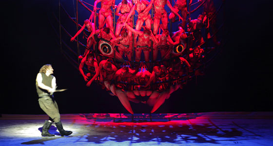 Всё, что мы видим на сцене, мы видим глазами малолетнего раздолбая Зигфрида. Именно поэтому образ нудного и надоедливого воспитателя, который не только называет себя одновременно и отцом, и матерью, но и выглядит, как замшелый конторщик Башмачкин, предстаёт перед нами в виде бесформенного нелепого гермафродита («Мать у них – Новосельцев!» — моментально проносится реплика из «Служебного романа» Э. Рязанова). К слову сказать Миме в этой постановке – абсолютная удача как режиссёра, так и исполнителя этой драматически и вокально сложной партии Вольфганга Аблингера-Шперраке. Оригинальной находкой стало изображение леса в форме искусственных деревьев, удерживаемых артистами миманса, которые сами изображают камни, а вертикальные акробатические инсталляции из артистов, подвешенных на поднимающихся тросах с березовыми ветками в руках, создают иллюзию мгновенно, прямо на наших глазах вырастающих деревьев. Не менее забавно представлен луг, где происходит комический диалог Зигфрида с птичкой: в прорезях зеленого сукна, которым накрываются участники массовки, вдруг проклёвываются человеческие руки-стебли, держащие головки подсолнухов. Вообще сценография спектакля полна интересных находок: наборный бронзовый интерьер хижины Миме и Зигфрида, огромная металлическая маска морды змея Фафнера, на которой шевелится группа акробатов, гигантские решетки, изображающие логово братоубийцы и прочие атрибуты мозаичной конструкции вызывали настоящее удивление своей неожиданностью…