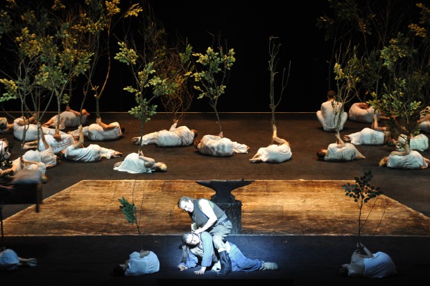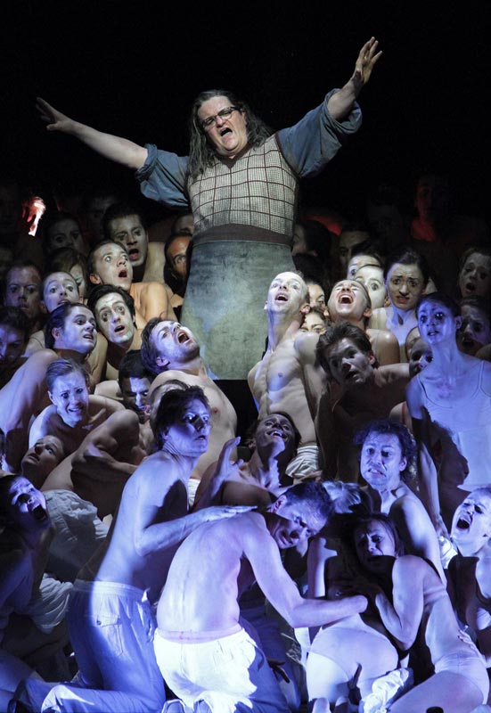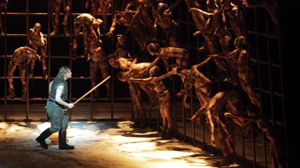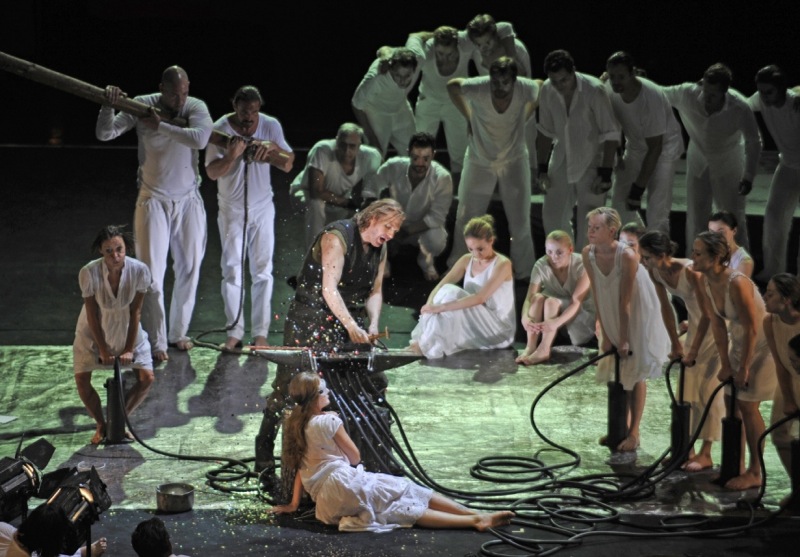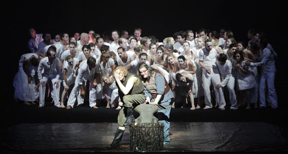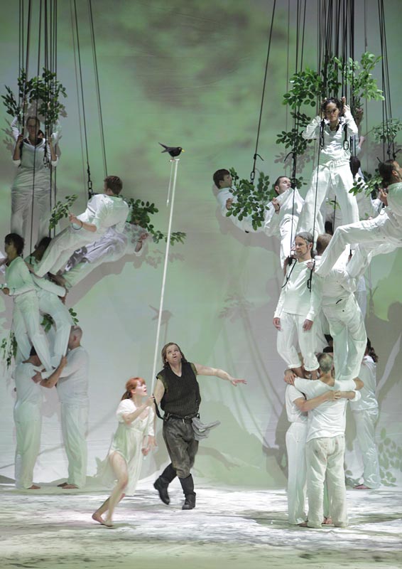 С точки зрения художественной безупречности, именно «Зигфрид» в новой версии вагнеровской тетралогии, представленной в Баварской опере режиссёром Андреасом Кригенбургом и художниками Харальддом Тором и Андреей Шраад, вызвал чувство безоговорочного приятия как у публики, так и у тех критиков, с кем мне удалось пообщаться после спектакля. И даже скучноватая вступительная пластическая инсталляция из огненной толпы людей в белом, из которой, как искры из печи, выскакивают то мужчины, то женщины, не смогла испортить впечатления об этом спектакле. Сама по себе идея пародийного преломления одной из самых нудных и неудобоваримых частей «Кольца» даже при первом приближении кажется настоящей находкой, ибо всерьёз драматизировать происходящие в этой «мальчиковой» драме события весьма рискованно. Во-первых, в «Зигфриде» слишком уж много всякой активно молчащей или упоительно поющей живности: и медведь, и птичка, и змей Фафнер, изображение которых на сцене непременно снижает и без того невысокий градус убедительности всего происходящего.