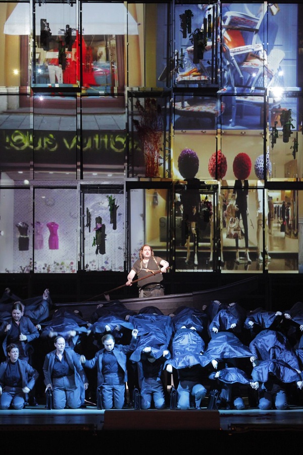 Во всем остальном оформление «Гибели богов» отличается удивительной статичностью и цельностью: гигантские витрины окаймляющие сцену действительно, как заметила одна дама, похожи на огромные витрины современного торгового центра, в многоярусных стеклянных проемах которого то возникает реклама разных брендов, то суетятся офисные клерки, то появляются, спускаются, поднимаются и исчезают герои представления. Даже здесь постановщики не отступаются от своей главной концепции незаменимости социальной биомассы для функционирования Власти: по телам людей, изображающих волны мчится лодка Зигфрида, в атриуме торгового «замка» Гибихунгов толпа офисного планктона суетится перед началом рабочего дня, потом выстраивается в очередь к конторщикам для визирования документов, потом принимает активное участие в действиях Хагена, одержимого идеей завладения кольцом, принадлежащим Зигфриду. Ради этой маниакальной цели руководитель торговой корпорации Гунтер и его сестра – невероятно обаятельная в своей неприкрытой туповатой вульгарности блондинка Гутруна – оказываются втянутыми в смертельную авантюру, разрушающую не только их имидж, бизнес, но и жизнь. На ограниченность устремлений и мотиваций Гунтера и Гутруны режиссёр указывает посредством массы эротических намёков, скабрезная натуралистичность которых тем более правдоподобна, чем меньше неприкрыта: никакой обнаженки, никакой физиологичности на сцене нет, но те движения, жесты и мизансцены, которыми сопровождаются монологи и диалоги Гунтера и Гутруны красноречивее откровенной порнографии.