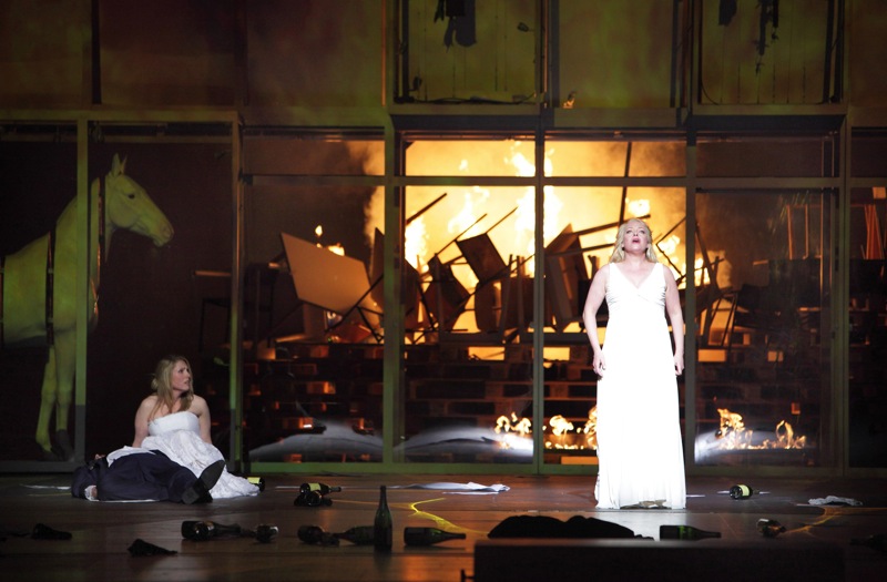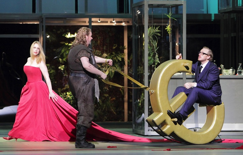 Кроме сексуальной невоздержанности, в спектакле упорно педалируется тема власти денег, возникающая в навязчивом присутствии символа европейской валюты, который появляется на сцене то в виде качалки, то в виде гигантского стола-подиума. Пожалуй, это единственные находки, которые могут претендовать на оригинальность, не считая огромного натурального костра, вызывающего некоторые опасения своей уместностью и безопасностью. Выделить что-либо более интересное в предложенной версии было бы весьма сложно, и даже сцена обмана Брунгильды Зигфридом едва ли не под копирку повторяет сцену из знаменитой байройтской постановки Патриса Шеро. Чего нельзя сказать о музыкальной стороне спектакля, которая в «Гибели богов» оказалась определенно самой удачной и самой яркой из всего цикла.