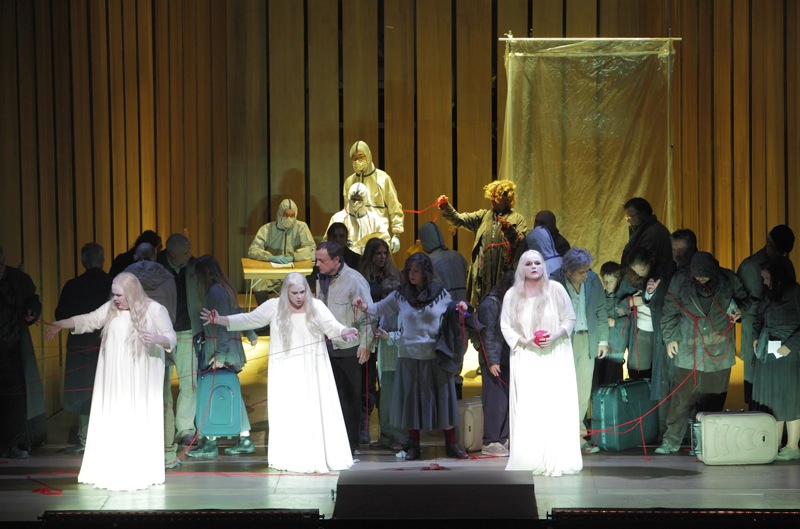 Под напряженные звуки драматичного вступления мы видим кадры хроники какого-то стихийного бедствия, похожего на наводнение. На сцене своеобразный Ноев ковчег, сильно напоминающий санитарный накопитель, где люди, прибывшие из зоны бедствия, проходят проверку на уровень радиоактивности. Мы видим, как у людей после проверки дозиметром отнимают дорогие их памяти фотоснимки. Между людьми, ожидающими своей участи, белыми призраками блуждают норны со своими нитями. Блуждают не так чтобы неуместно, но как-то не очень убедительно. Но беспокоит другое: эта инсценировка вступления не только никак не «проявляется» в дальнейшем, но и мизансценически выполнена с расчётом на то, что зрители не поймут исполняемого текста вообще, ибо с текстом в этой сцене не стыкуется вообще ничто и никак. Вот там просто даже натяжку сделать нельзя: не за что тянуть и не на что натягивать. Абсолютная параллельность картинки смыслу звучащего материала. Эта очевидная нелепость явно портит впечатление, но остаётся всё ещё в рамках общего провокационного флёра, которым подёрнута вся режиссёрская концепция новой версии «Кольца».