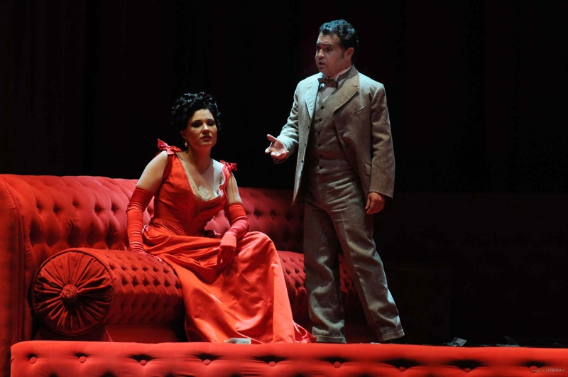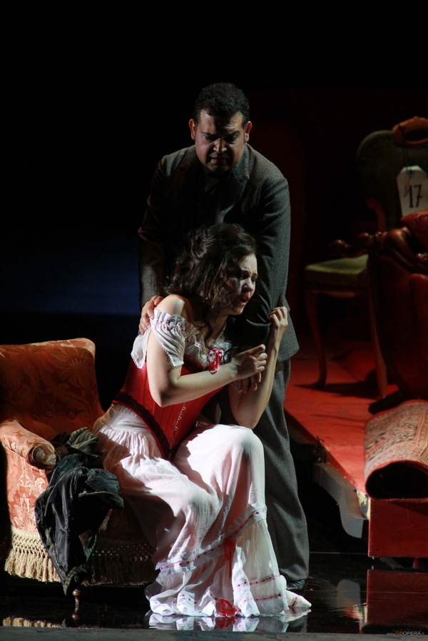 Венесуэлец Акиле Мачадо, который восхитил меня в партии Рудольфа в “Богеме” прошлой осенью, в этот раз разочаровал. За исключением нескольких моментов, как, например, кабалетта “O mio rimorso, o infamia” (без репризы, но с хорошим высоким до), или его обличительной «речи» против Виолетты, где он мог продемонстрировать всю красоту и стойкость лирического вокального аппарата, эта партия показывала лишь ограниченность его возможностей. Каждая попытка петь пиано приводила к слабому носовому фальцету, поэтому исполнение страдало от отсутствия опоры звука. Вполне возможно, что после более тяжеловесного репертуара (он недавно дебютировал в операх “Тоска”, “Адриенна Лекуврёр”, “Норма”, “Кармен”, “Симон Бокканегра”, “Сила судьбы”), партия Альфредо больше ему не подходит. Вокальная усталость также была заметна в исполнении болгарина Владимира Стоянова (Жермон). Он с трудом пропел свои ноты без неприятных происшествий, но ему не хватало дара перевоплощения.