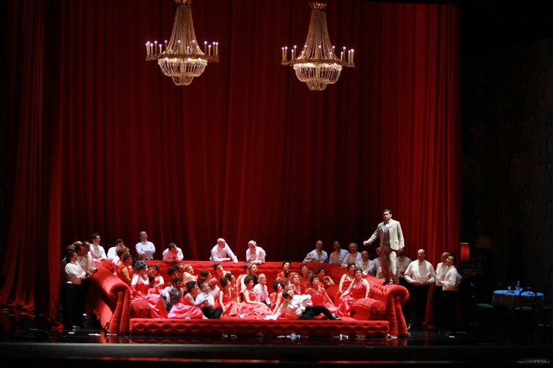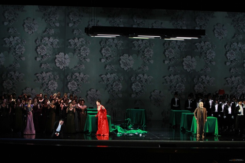 Постановку “Травиаты”, которая впервые была представлена публике в 2009 году, осуществил Франко Рипа ди Меана вместе с Эдуардо Санки (сценография) и Сильвией Аймонино (костюмы), перенеся действие оперы в конец 19 века (как делал в своё время Лукино Висконти в исторической постановке с Марией Каллас). Кроме того, Виолетта скидывает туфли в первом действии во время исполнения арии, а гости в доме Флоры исполняют танец цыганок и матадоров – всё это отсылки к спектаклю Висконти.