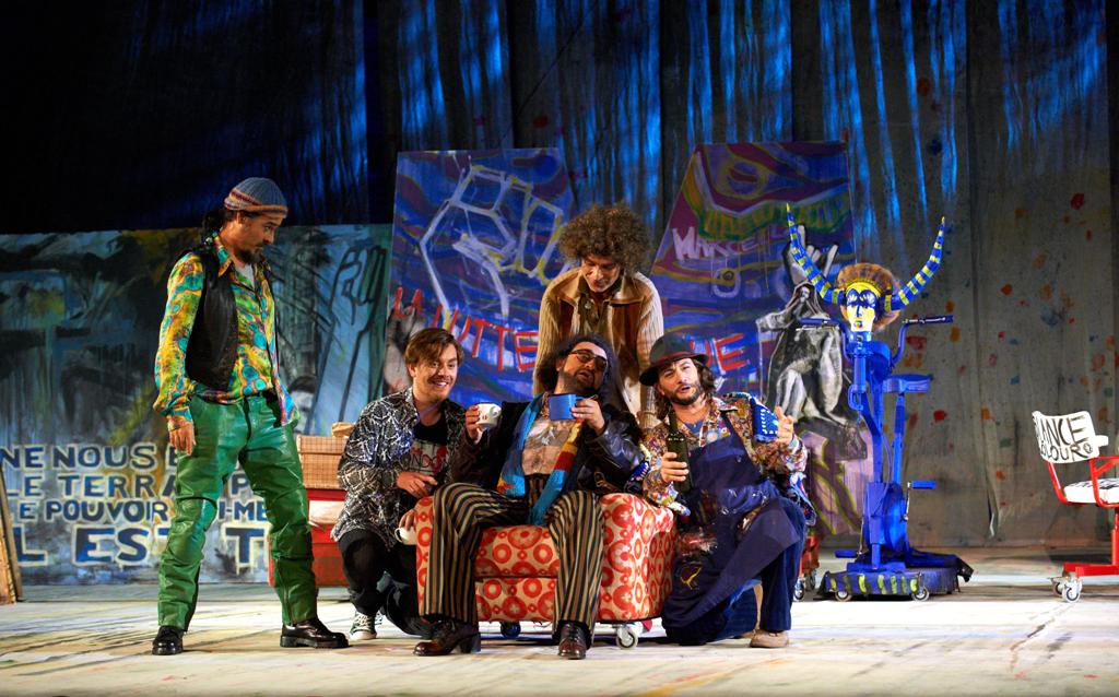 В мансарду, где обретаются «четыре мушкетера», попадают через отверстие в полу, — идея, быть может и не слишком оригинальная (использованная несколькими годами ранее в Арена ди Верона сценографом Уильямом Орланди, декорации для «Богемы в Сферистерио созданы Федерикой Паролини). Зато оригинальна атмосфера мансарды, загроможденной кучей нужных и ненужных вещей. Второй акт – нечто вроде выставки характерных типов эпохи контестации, в штанах модели «клеш» и прическах, напоминающих африканские. Оригинален и акт третий – вместо парижской заставы на сцене сталелитейный завод, а грандиозная кирпичная стена Сферистерио увешана плакатами с призывами к миру и против загрязнения окружающей среды. Мими умирает именно потому, что надышалась вредными для здоровья выбросами в атмосферу сталелитейного завода. Умирает на больничной койке, а не в мансарде, как в опере Пуччини: из мансарды друзей погнали за неуплату аренды, а в больничной палате Рудольфа нет рядом с ней, так как произошло какое-то недоразумение, доктора и возлюбленный несчастной девушки не поняли друг друга...