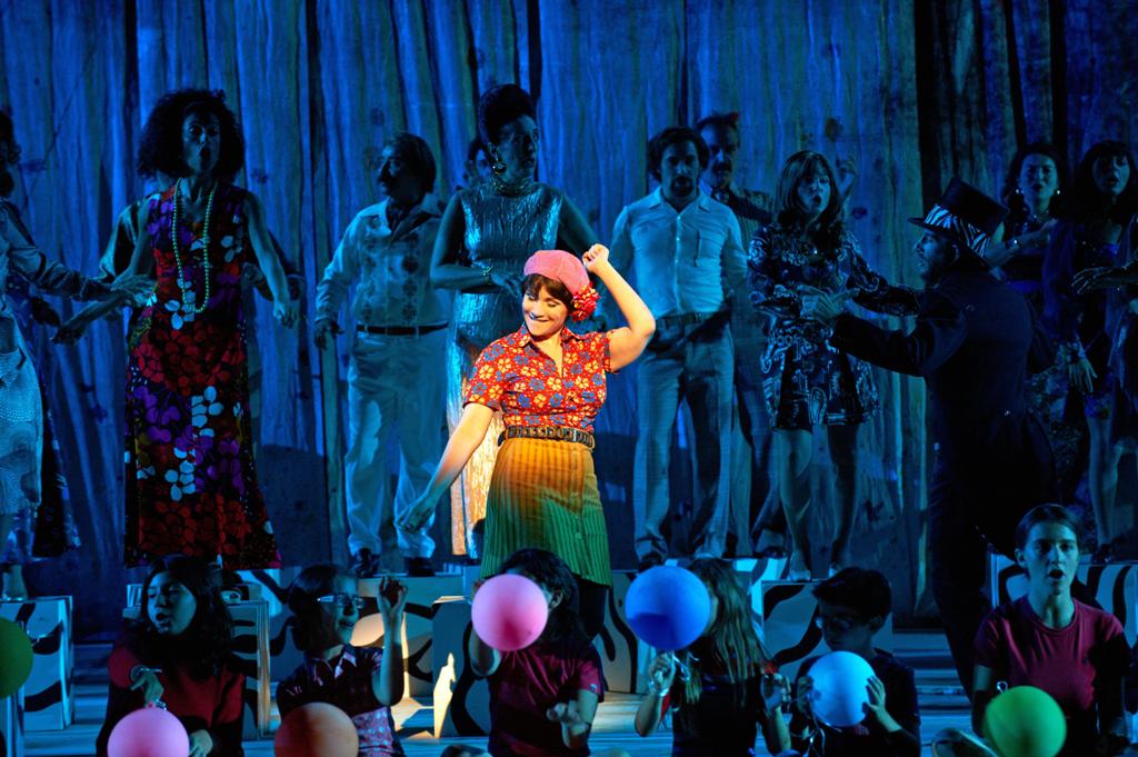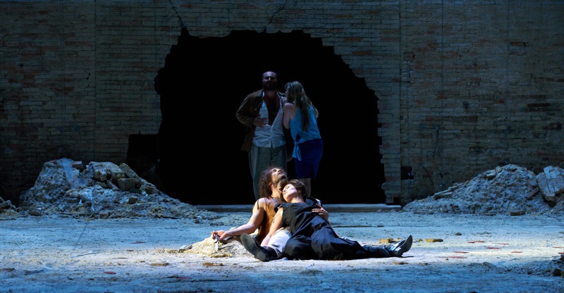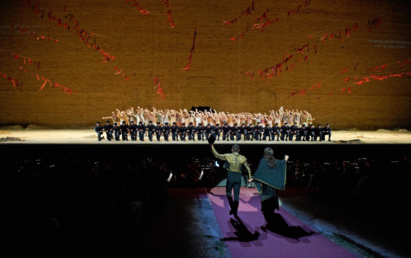 Разговор о «Кармен» так и тянет начать цифрой, в которую встала постановка оперы Бизе на сцене Сферистерио, воистину ничтожно малой, всего пятьдесят тысяч евро, и это при том, что в нее включена стоимость трехсот костюмов! Эта превосходная «Кармен» создана «из ничего», в стиле, который так мил автору этих строк. «Играют» неизменная кирпичная стена Сферистерио, разноцветные флажки, типичные для испанских площадей, да металлические заграждения (художница Мария Спацци). В этом случае спектакль также обязан успехом режиссеру драматического театра, а именно Серене Синигалье, художественному руководителю Teatro Ringhiera в Милане. Это «Кармен» наших дней, ее действие развивается где-то на периферии большого города, где обитают чуть ли не отбросы общества, часто раздетые почти догола, которых на должном расстоянии держaт одетые в черное молодцы — разновидность омоновцев — умело оперирующие угрозами, оружием и металлическими заграждениями.