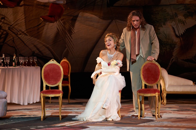 Состав певцов в этой ставшей уже классической «Травиате» неоднороден, но спектакль никак не может быть назван «Травиатой» без Виолетты». Греческая певица Мирто Папатанасиу обладает physique du role (одинаково хороша в шикарном бальном платье и парике блондинки и в скромных нарядах с темными волосами и гладкой прической), прекрасно двигается, демонстрирует значительный драматический темперамент; героиня Верди возникает перед глазами как живая. С вокальной точки зрения претензий предъявить можно немало: «белый звук» в высоком регистре, доставляющая немалое страдание уху тремоляция, крайне неотчетливая дикция.