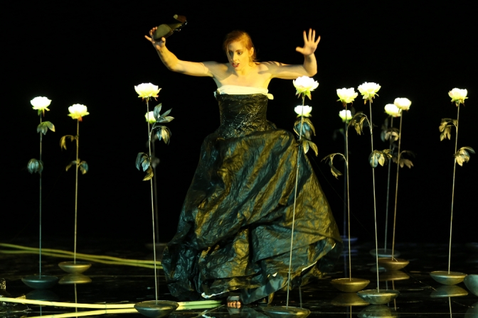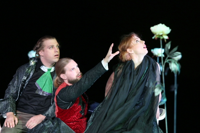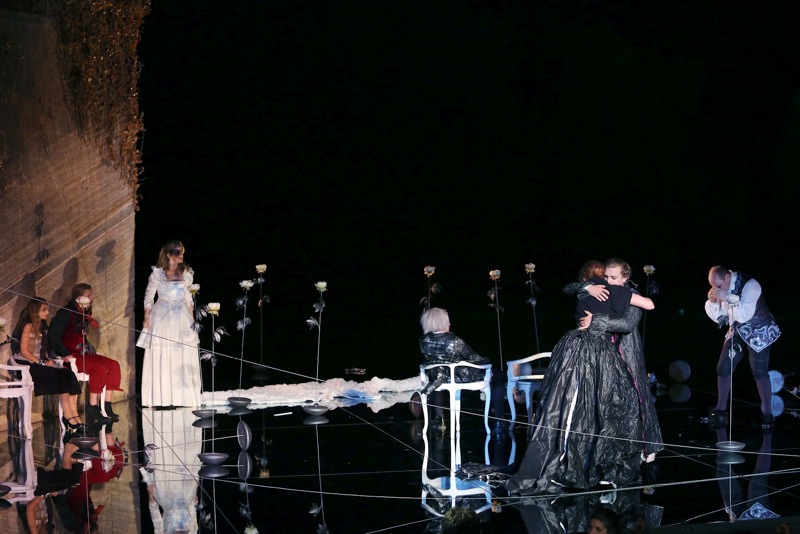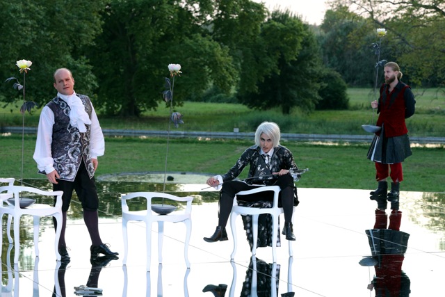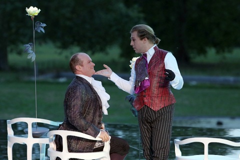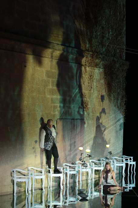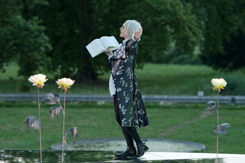 Акустическое фиаско, к сожалению, было не единственной неприятностью описываемого вечера, хотя, безусловно, главной. Режиссёр и одновременно художник по костюмам Венсан Буссар развернул действо на зеркальной сцене и среди зеркал – естественный сад, в котором проходил спектакль, и звёздное небо отражались в гигантских линзах, создавая прекрасное ощущение натуральности. Экономное, но красивое решение. Сценограф Венсан Лемер добавил в это пространство несколько дюжин светящихся цветочных гирлянд, и иллюзия волшебного сада получилась абсолютной. Более ничего невозможно сказать о решении спектакля: в остальном он был похож на дефиле, главной целью которого была демонстрация костюмов – не всегда удачных, не всегда эстетичных, о некоторых из которых приходили мысли, что они взяты на прокат из ближайшего ателье театральной бутафории. От режиссуры веяло явным дилетантизмом, и на всём лежал немалый налёт самодеятельности – это было более чем странно, поскольку цены на дальние места составляли 140-150 евро (что уж говорить о ближних рядах!), а сама постановка является копродукцией аж четырёх европейских участников – Большого театра Люксембурга, Оперы Тулона, Оперы Руана и собственно фестиваля в Эксе.