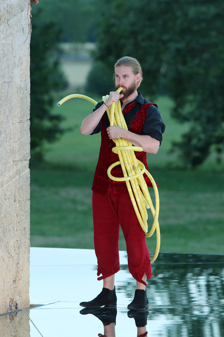 Но есть при этом одна серьёзная проблема, заметно всё портящая и фактически обесценивающая столь оригинальную задумку – акустика. Стена шато, у которой расположили сцену (но почему-то не непосредственно перед нею, а где-то сбоку), плохо отражает звук, порывы ветра, шум листвы, постоянное стрекотание цикад, слишком выдвинутый вперёд по сравнению со сценой оркестр – всё это не идёт на пользу звуковому балансу. Видение само по себе впечатляет, как на изысканной почтовой открытке или рекламном постере, но для голосов такое решение оказывается убийственным – певцам не удаётся донести до публики и трети своих рулад, они теряются за естественными природными шумами, звук разлетается во все стороны – музыкальная ткань рассыпается у публики на глазах. Античные амфитеатры или средневековые замки, в которых часто проводят всевозможные шоу open-air, обладают естественной акустикой, и в этих случаях у постановщиков очень много возможностей. Но фактически на открытом пространстве всегда требуется некоторое звукоусиление, искусственная акустическая корректировка – в Эксе этого сделано не было и опера, увы, потерпела большое фиаско, поскольку если в музыкальном театре вы не имеете возможности слушать музыку, то всему остальному – грош цена.