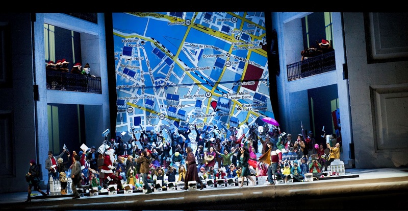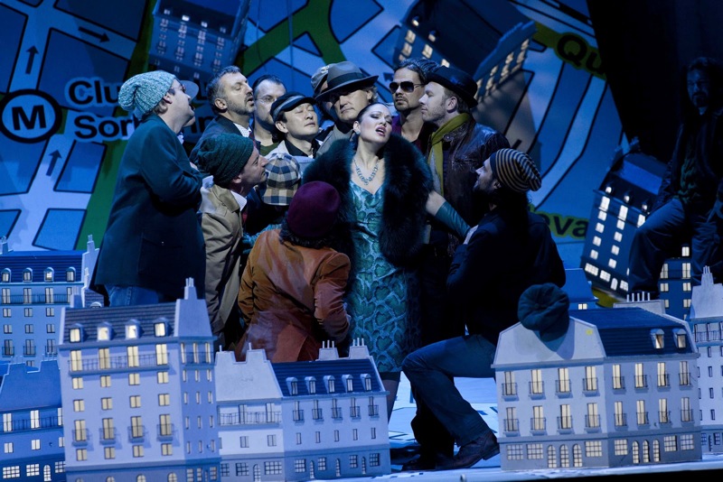 Если все события происходили в 2012 году, как следует из надписи на гигантской туристической карте Парижа, которая служит и зеркалом сцены, и ширмой во втором и части третьего действий, то почему умирающей Мими просто не вызывали скорую помощь? Зачем понадобилась муфта, не говоря уж о необходимости продавать пальто Коллена? И разве нынешняя молодежь так же беспомощна? Разрушая исторически обусловленный видеоряд, постановщики роют сами себе могилу, не в силах преодолеть внутреннее противоречие этого произведения Пуччини: то, что вызывает умиление и сочувствие в декорациях XIX века, в антураже наших дней вызывает лишь недоумение и раздражение. Но если отключить голову и попробовать насладиться лишь удачными постановочными ходами и музыкальной стороной спектакля, то всё становится на свои места.