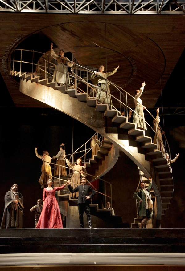 Постановка «Матильды» – самая яркая звезда в созвездии мероприятий в честь Пезарского лебедя. Это постановка 2004 года по прошествии восьми лет все так же полна жизни, свежа и остроумна. Об этом говорит длительная овация публики, которая вознаградила артистов аплодисментами стоя. Все пленяет в этом длинном, но совершенно неутомительном спектакле: легкая сценография, остроумная режиссура, очаровательные и блестящие артисты. В замок, где забаррикадировался Железное Сердце, можно попасть только по двум винтовым лестницам – их только и видно на сцене. Атмосфера довольно мрачная – в полном соответствии с «приветственной фразой» Коррадино: «Кто войдет без приглашения, тому разобьем башку». Выдвижная платформа – что-то вроде подъемного моста, что соединяет обитателей замка с остальным миром. Она же возвышение, с которого публике так хорошо видно упивающегося соловьиными трелями солиста-белькантиста. Серджо Трамонти придумал всю эту «механику», обыграть которую режиссеру Марио Мартоне было только в удовольствие. Инвективы Коррадино с высоты лестницы производят большой эффект, двум соперницам сам Бог велел обменяться «любезностями» с параллельных ступенек, крестьяне с дарами проникают в замок, т.е. на сцену, из окрестных деревень, т.е. зрительного зала, карабкаясь по выдвижной платформе, а придворный поэт поет свою арию, «нависая» над оркестром на ней же.