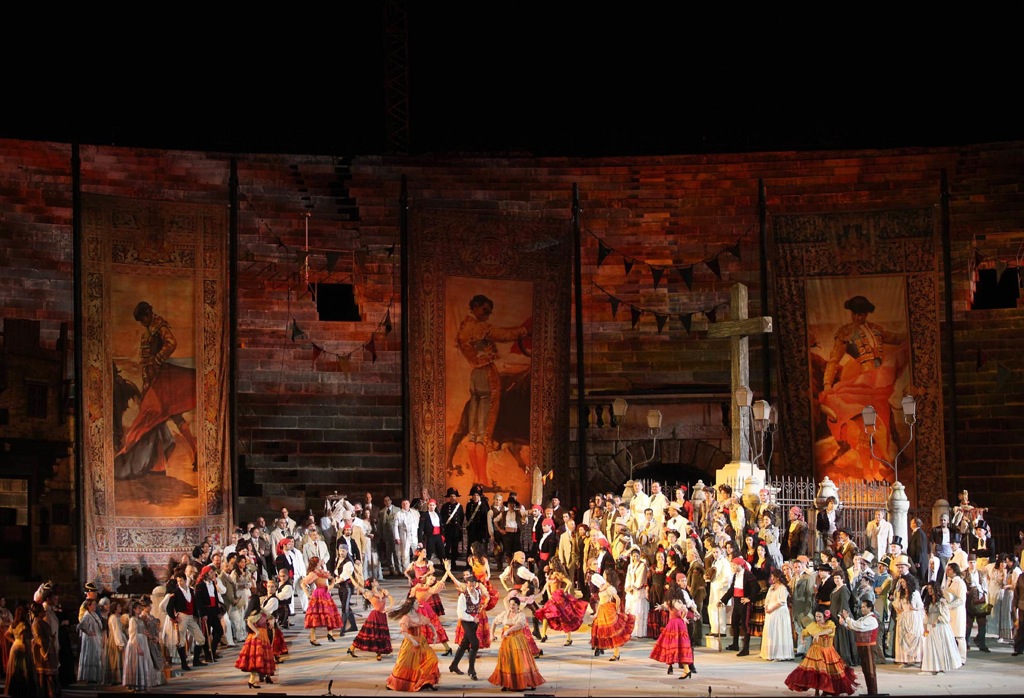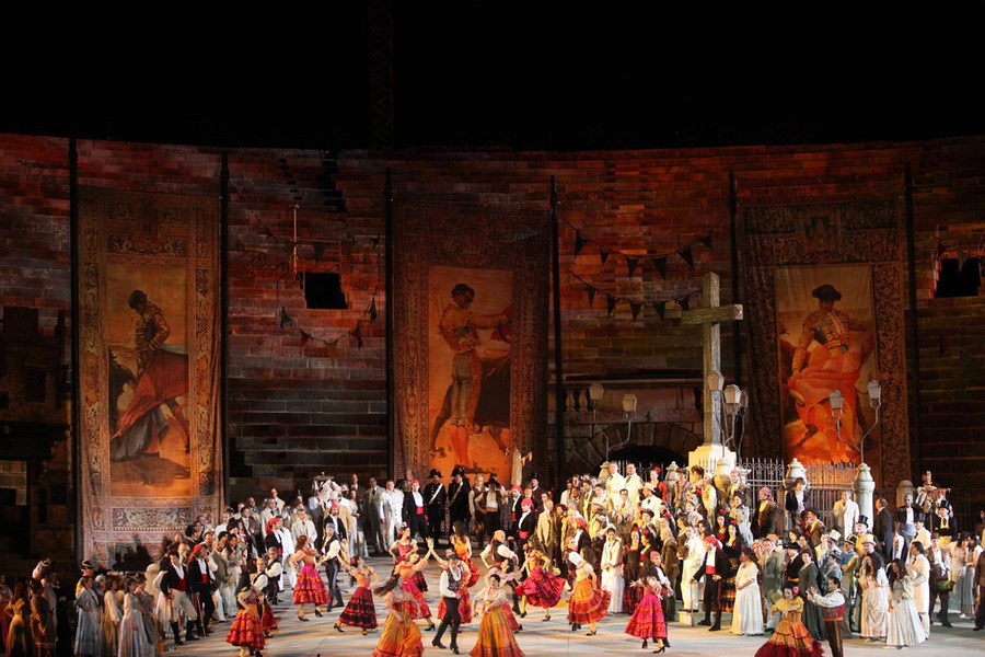 На афише, помимо инаугурационного, крайне роскошного и столь же вялого спектакля «Дон Жуан» (который наш сайт отрецензировал отдельно), стоят типично «аренианские» названия: «Аида», «Кармен», «Турандот» и «Тоска», к которым с прошлого сезона добавили оперу на «священную» для Вероны тему, но не входящую в традиционный «большой репертуар», - «Ромео и Джульетту» Гуно. Автор вынужден миновать истинный «бренд» Арены, «Аиду», которую в этом году ей не привелось увидеть, и начать с давно ставшей классической «Кармен» в постановке Франко Дзеффирелли.