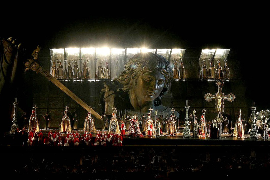 Премьера «Тоски» в постановке аргентинского дизайнера и режиссера Хуго Де Ана восходит к 2006 году, когда еще не изгладились из памяти воспоминания о его совершенно исключительном «Набукко». Со времени премьеры спектакль пару раз возобновляли, и этот выбор всегда доказывал свою беспроигрышность: тройственный союз «Тоска» - Арена ди Верона – Хуго Де Ана побеждал и побеждает.