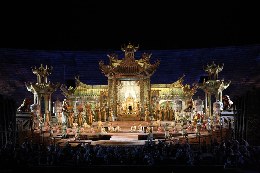 В «Турандот» торжествуют принципы, за которые почтенный 89-летний художник с энергией молодого петушка все еще бросается в бой. Речь идет об излюбленном престарелом мастером стиле kolossal, две основные характеристики которого – преувеличенно пышная сценография и паническая боязнь пустоты. Если Дзеффирелли хотел поразить или ослепить, ему это удалось: императорский дворец действительно сказочно красив, а глаза зрителей порой не выдерживают сияния золота. Что рядом с его блеском весь остальной мир? Только серость и ничтожность. Особого признания заслуживают костюмы Эми Вада (которая не нуждается в представлении: она получила «Оскара» за работу над фильмом Акиры Куросавы «Ran» и уже сотрудничала с Дзеффирелли в «Мадам Баттерфляй»). Что касается боязни пустоты, то с возрастом она, похоже, у тосканского режиссера увеличилась: немыслимое количество статистов и хористов марширует по сцене. Шествия мастер считает неотъемлемой частью «великой итальянской оперной традиции». Поскольку все предсказуемо, некоторой скуки не избежать, но справедливости ради надо признать, что подобная постановка полностью отвечает фирменному стилю Арены ди Верона и, несомненно, нравится публике, большинство которой составляют туристы.