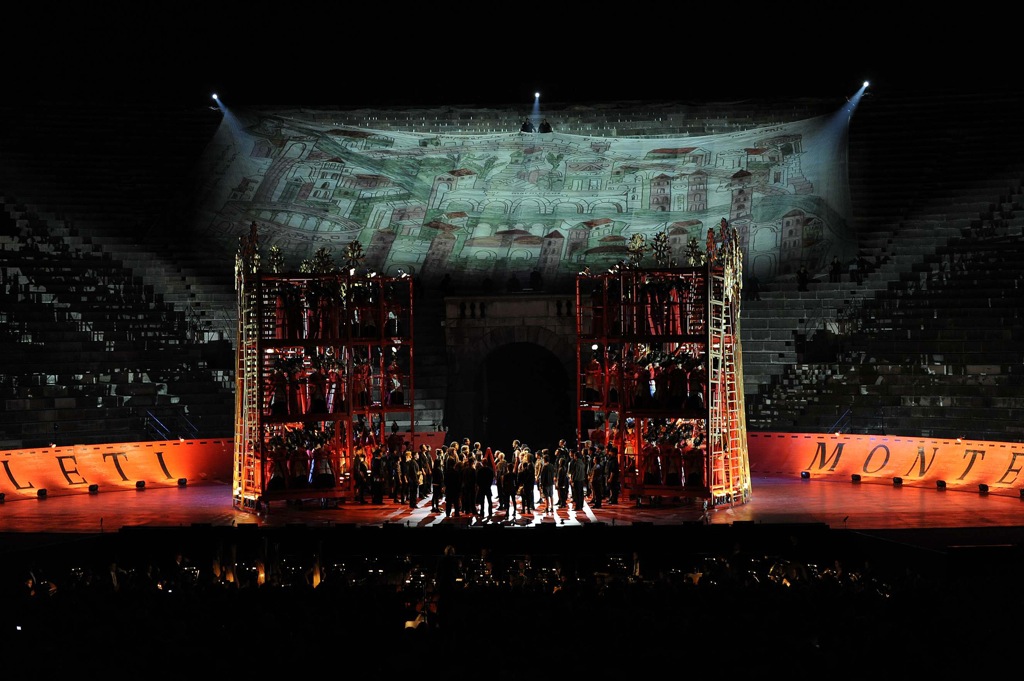 Постановкой «Ромео и Джульетты» в Арене дебютировал Франческо Микели, у которого никак не отнять фантазии и идей. Спектакль претендует на существование вне времени, ищет возможности пробиться к юным сердцам, сделать так, чтобы в оперу ходили не только седовласые обладатели благородных морщин. Средневековая история, получившая бессмертную обработку у Шекспира, проецируется в наше время. Мир расколот надвое, безумное отрицание взаимопонимания торжествует. Ромео и Джульетты приговорены к бесконечным подъемам и спускам по лестницам. Удачен и трогателен финал: влюбленные в световом луче спускаются со сцены в зал и идут по длинному центральному проходу.