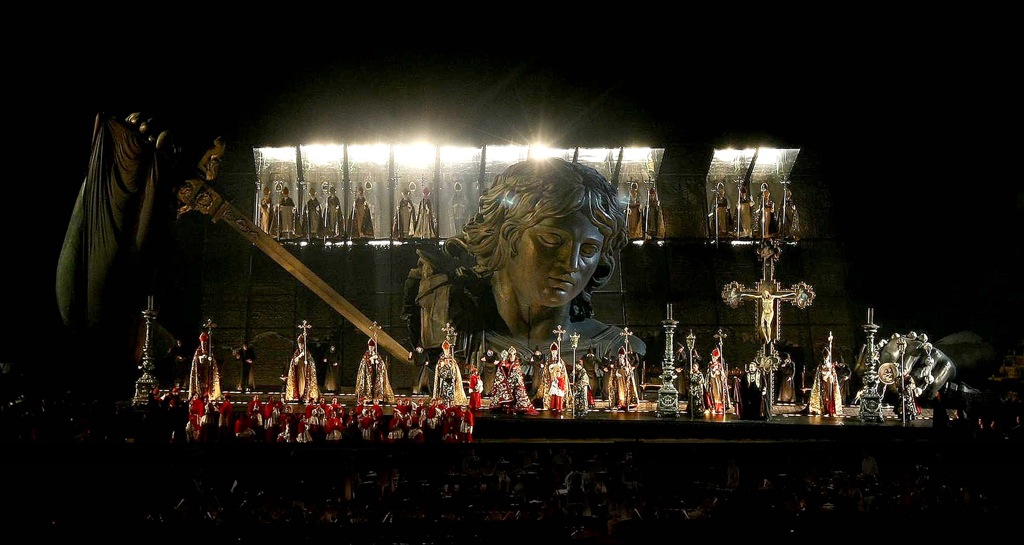 В том, как Де Ана организует пространство, всегда есть нечто поразительное и в то же время узнаваемое. В том знаменитом «Набукко» была наклонная панель: видоизмененная, она присутствует и в «Тоске». Панель, подобная ящику Пандоры: в ней непременно откроются «дыры», из которых посыплются «сюрпризы». На огромной сцене Арены в «Тоске» Де Аны доминирует голова Ангела. Того самого, из замка Сант-Анджело, на верхней площадке которого расстреляют несчастного Каварадосси. По бокам – элементы той же самой скульптуры: слева рука с длинным мечом и справа кисть, сжатая в кулак. В третьем действии воинственно поднятая рука плавно спускается на землю с неумолимостью, в которой приближается страшная развязка. О шумящих далеко от величественных красот Вечного Города наполеоновских войнах напоминают пушки.