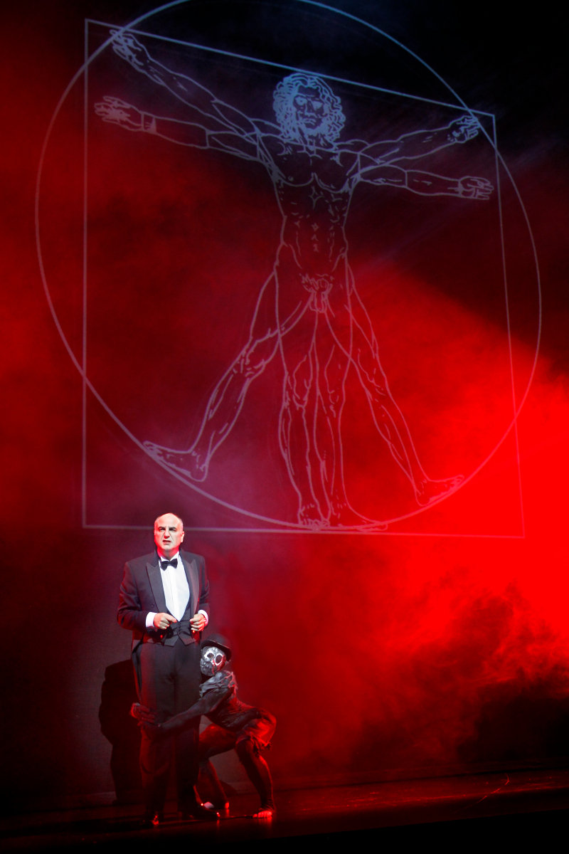 Всё это было бы «прекрасно», и вполне вписывалось в длинный реестр человеческих слабостей под заголовком «тщеславие», но музыка Берлиоза, которую заставили быть спамом в буйном спектакле, была совершенно не виновата в том, что её так использовали. Как использовали и «Пропорции мужской фигуры по Витрувию» Леонардо да Винчи, украшавшие занавес просцениума. Две мужские фигуры, вписанные в круг и квадрат, оказывались то вверх ногами, то в двусмысленной камасутрской позиции по отношению друг к другу, что должно было пригласить зрителя присоединиться к весёлому шоу. Сам режиссёр высказался об этом в интервью: