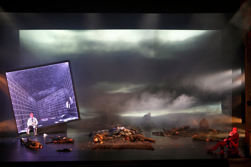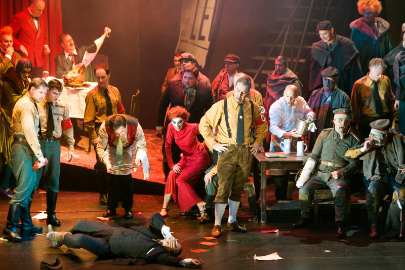 Всё начинается невинно, нам показывают ожившие Окна РОСТА. На тему Ракоци-марша деятели Антанты делят мир, предлагаемый им Мефистофелем в виде огромного торта, и картинно ссорятся. Это приводит к Первой Мировой войне. Сцена в кабачке Ауэрбаха – это Пивной путч, где заодно фюрер со товарищи картинно же расстреливает штуки четыре пролетариев в кепках, беззвучно агитировавших за Советскую власть на фоне плаката с Лениным и бессмертной написью по-русски: «Ленин жил, Ленин жив, Ленин будет жить», – вот интересно, кто, кроме меня, смог прочесть кириллицу и понять, к чему висел портрет? Не так уж расхож во Фландрии образ Ильича, чтоб узнавать его в постановке французской оперы…