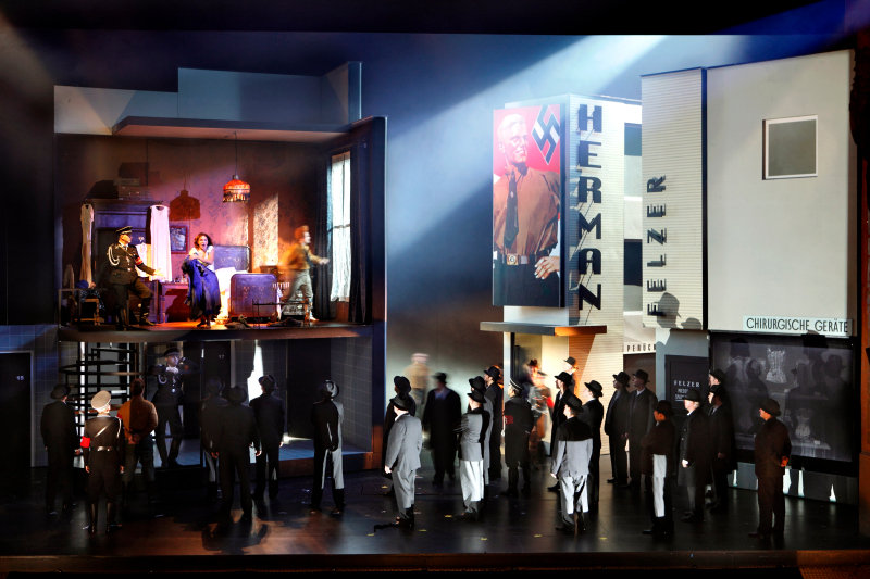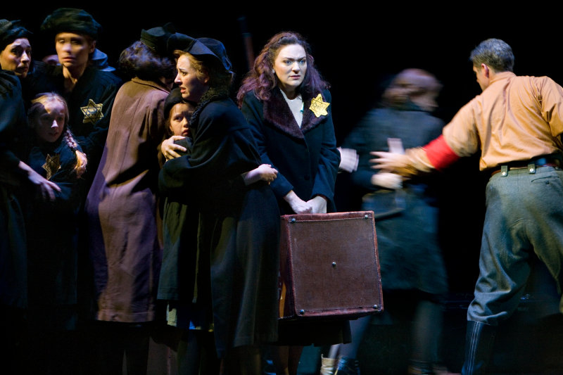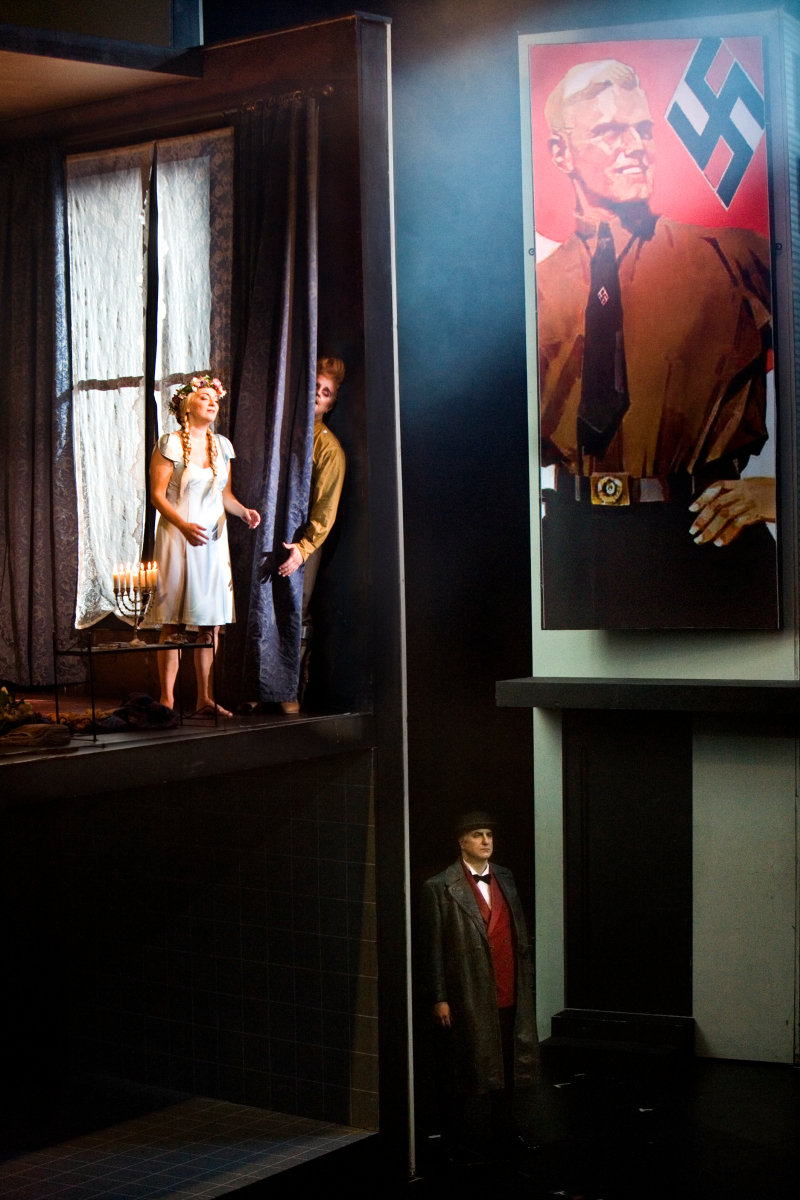 После такого с позволения сказать начала, отдающего явным глумлением над действительными историческими, отнюдь не музыкальными событиями, настороженность долго не проходит. И не зря. Всё дальнейшее действие можно описать так: Мефистофель услужливо организовывает для Гитлера звездопад из желтых шестиконечных звёзд, Гитлер ими догадливо пользуется, и следующие сцены с теми же преувеличенно карикатурными телодвижениями изображают события Хрустальной ночи с битьём витрин и избиением евреев, и затем – логично до конца спектакля – следует разлучение родителей и детей, погрузка евреев в поезд на Аушвиц, гора трупов и вообще краткий курс истории Холокоста в живых и весёлых картинках.
