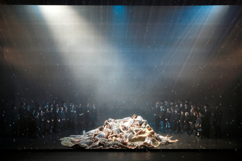 Оркестр с Д.Юровским трудился сам по себе, сцена бушевала отдельно. Сомкнуть два предлагаемых уровня не представлялось возможным. Оркестр продемонстрировал слаженную игру с нежными нюансами, и, что очень порадовало, множеством оттенков выразительного и проникновенного piano, что в наши дни уже редкость. Так что оркестру за исполнение текста партитуры можно смело ставить приличную оценку. Если, правда, закрыть глаза на ужасающе рассстроенную арфу и не строящие вообще ни с чем флейты к концу спектакля.