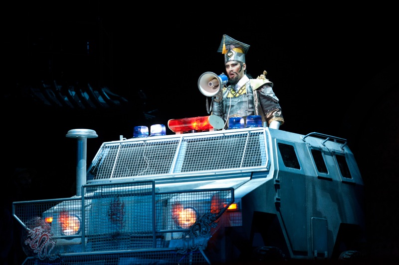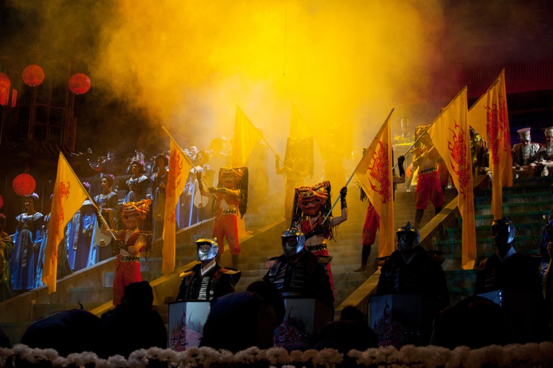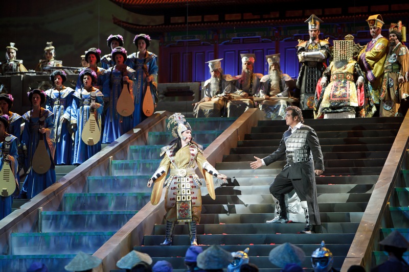 Спектакль, оформленный безвременно ушедшим от нас в этом году Игорем Гриневичем, рисует вроде бы традиционный, хрестоматийно оперный, сказочный Китай: через всю сцену тянется глухая и высокая стена, за которой видны контуры пагод Запретного города; вышки-колонны перед ней украшены привычными китайскими фонариками. Мандарин, вещающий народу волю императора, выезжает из ворот Запретного города на броневике, который несколько инороден в этом «историческом» этнографическом антураже, но, видимо, призван подчеркнуть всё подавляющую сущность тоталитарного режима террора, что установила в своей империи Турандот. В отличие от большинства постановок этой оперы, где яркие цвета, особенно часто используемые красный и золотой, доминируют на сцене, в казанской «Турандот» они – лишь редкие вспышки, вкрапления (в красивых, с выдумкой, порой даже изощрённой, костюмах героев, созданных Юлией Ващенко, в развевающихся императорских штандартах) в мрачный, тёмный мир империи зла и жестокости. Дистанцию власти от народа устанавливает не только великая стена, но и гигантская ступенчатая пирамида о двух лестницах, возникающая в сцене загадок: у её подножия толпится простой люд, а на вершине восседает правитель в окружении свиты. И пусть лестница-пирамида красива, пусть по ней струится вода, создавая завораживающую картину, ситуация, тем не менее, всё равно жёсткая и бесперспективная: элита никогда не снизойдёт до черни. Впрочем, разве только в оперном Китае?