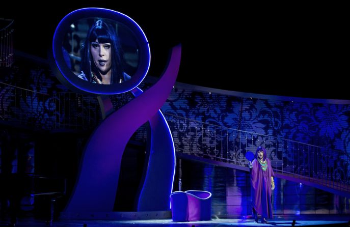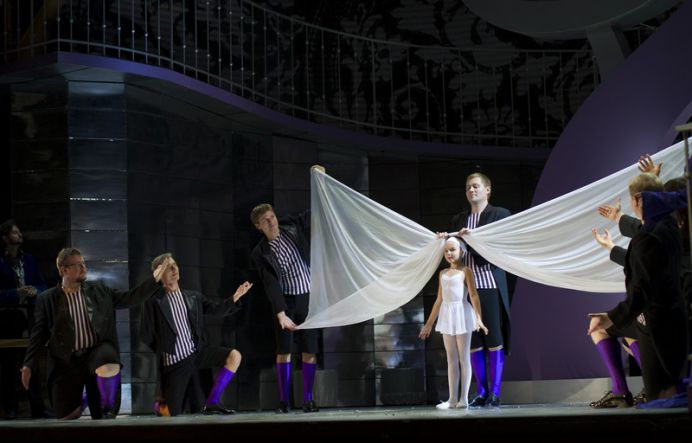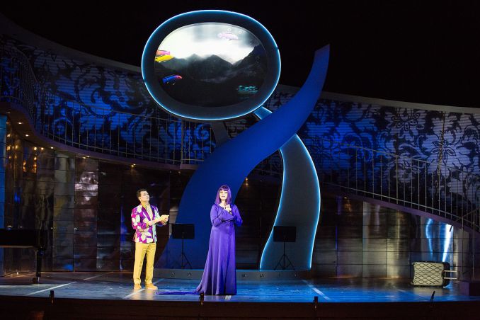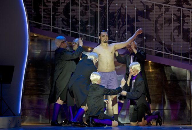 Немаловажную роль в этом опрощении сыграло оформление спектакля. Видеоаквариум с люминесцентными рыбками, выполняющий по ходу действия функцию «зеркала», в котором «отражается» главная героиня, выглядел, конечно, весьма эффектно, но ощущения дежа вю никак не отменял. Дело в том, что сценография Виктора Герасименко вызывает отчётливые ассоциации с третьей («бордельной») картиной «Руслана и Людмилы» Д. Чернякова: и подиум с балюстрадой (хотя такого типа подиум украшает и вторую картину спектакля «Таис» в постановке Дж. Кокса в «Метрополитен-опере»), и сама гофрированная фактура покрытия стен, и узнаваемый орнамент «обоев», - всё выглядит уже виденным, причем виденным совсем недавно.
