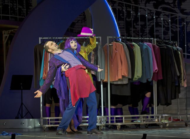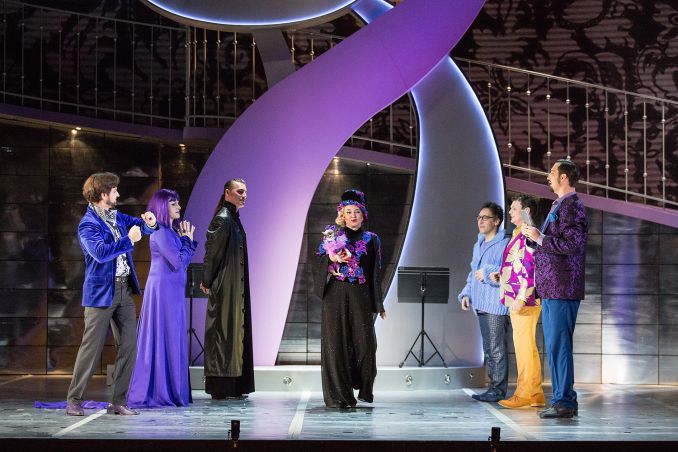Но если эту «узнаваемость» сценографии еще можно легко списать на субъективную неуместность собственной эрудиции зрителя, то на что списывать доминирование в костюмах кричащего фиолетового цвета в давящем сочетании с сиреневым, я, признаться, не знаю. Ассоциации с коллекциями миланского дома моды «Etro», пожалуй, тоже не подойдут, так в орнаментальной эклектике «Etro», кроме фиолетового, золотого, синего и чёрного, мягко говоря, очень много и других цветов. Между тем, в костюмах, созданных Виктором Герасименко, и гольфы с манишками слуг, и пятнистый разухабистый пиджак Оливье, навеянный, по признанию художника, образом Евгения Евтушенко (старшему поколению хорошо известна приверженность знаменитого поэта к вычурным пёстрым пиджакам – прим. ред.), и насыщенно синий бархат пиджака Ля Роша и, наконец, кричащий «прикид» главной героини, состоящий из фиолетового платья в-пол-и-в-шлейф и фиолетового же парика «сверху», своей цирковой аляповатостью отвлекали, затмевали и нервировали. Разумеется, на территории арт-поступков релятивистское «на вкус и цвет» иногда, хоть и не часто, способно остудить негодование не только консервативно настроенных зрителей, но и строгих пуритан-профессионалов, но вся костюмная гамма спектакля настолько серьёзно конфликтовала с интеллектуальностью того, что она оформляла, что становилось как-то неловко за художника, не уловившего идею и не угадавшего суть декорируемого произведения.