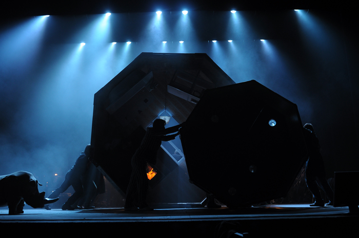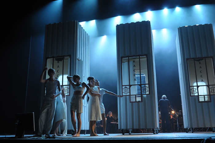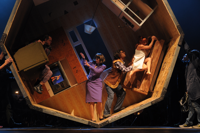 Режиссер Екатерина Василёва старательно следует идее предложенного Раевой синтетического театра, пытаясь выстроить многоплановое действо с видеоинсталляциями, героями, заточенными в подвижную конструкцию-восьмигранник, танцующими танго гигантскими богомолами и оркестром, которому отчасти передоверены реплики хора. Увы, уследить за всеми эти планами, то и дело разъезжающимися в разные стороны, трудновато.