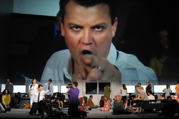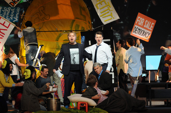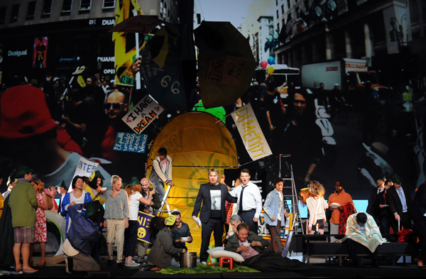 Что же это были за повстанцы? Ван Хове и тут пришёл нам на помощь с простодушно напечатанным в программке разъяснением, что речь идёт о движении Occupy Wall Street, которому он, судя по всему, весьма сочувствует. Ворвавшись в офис, повстанцы первым делом разбили палаточный лагерь, укутались в одеяла (одно даже великодушно выдали Макбету – вместо того чтобы, как этого требует либретто, убить его) и принялись разливать по мискам какую-то неприглядно выглядящую похлёбку. Всё это прямо в офисе, на 50-м этаже.